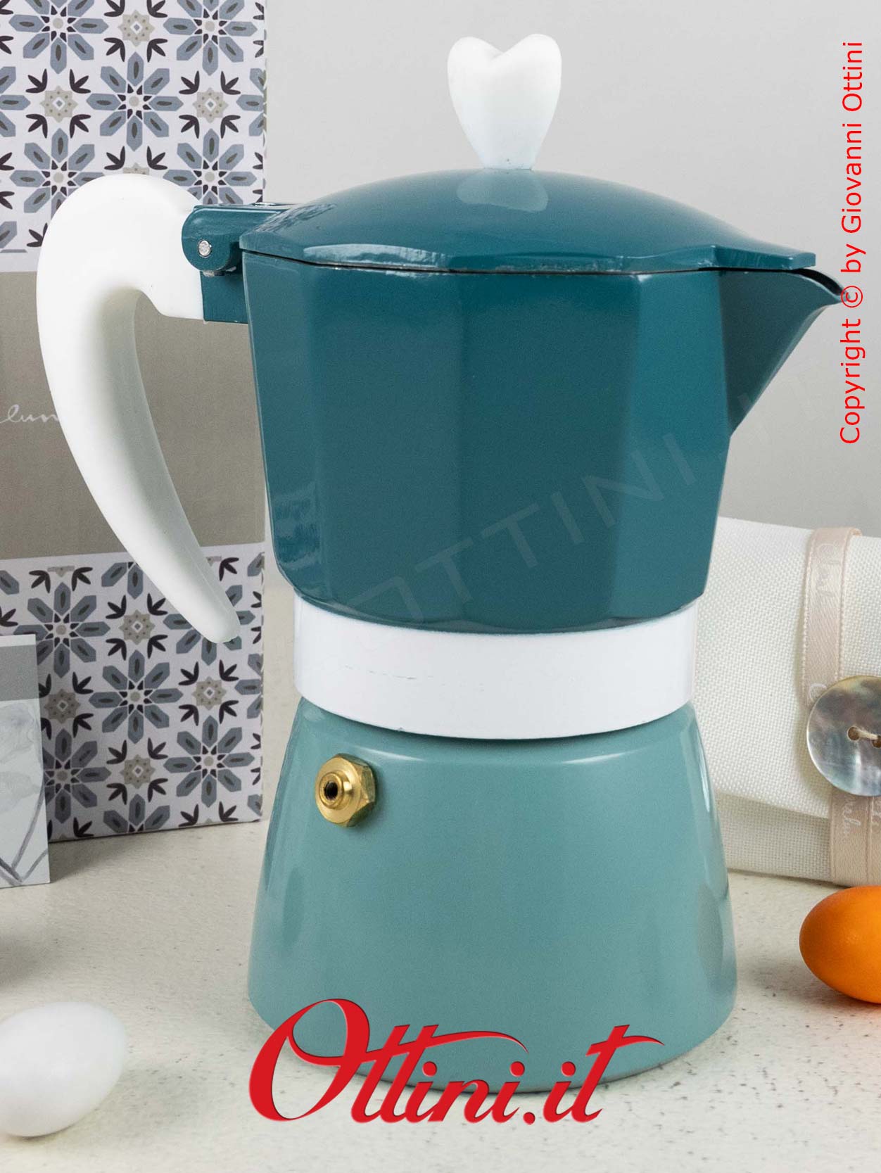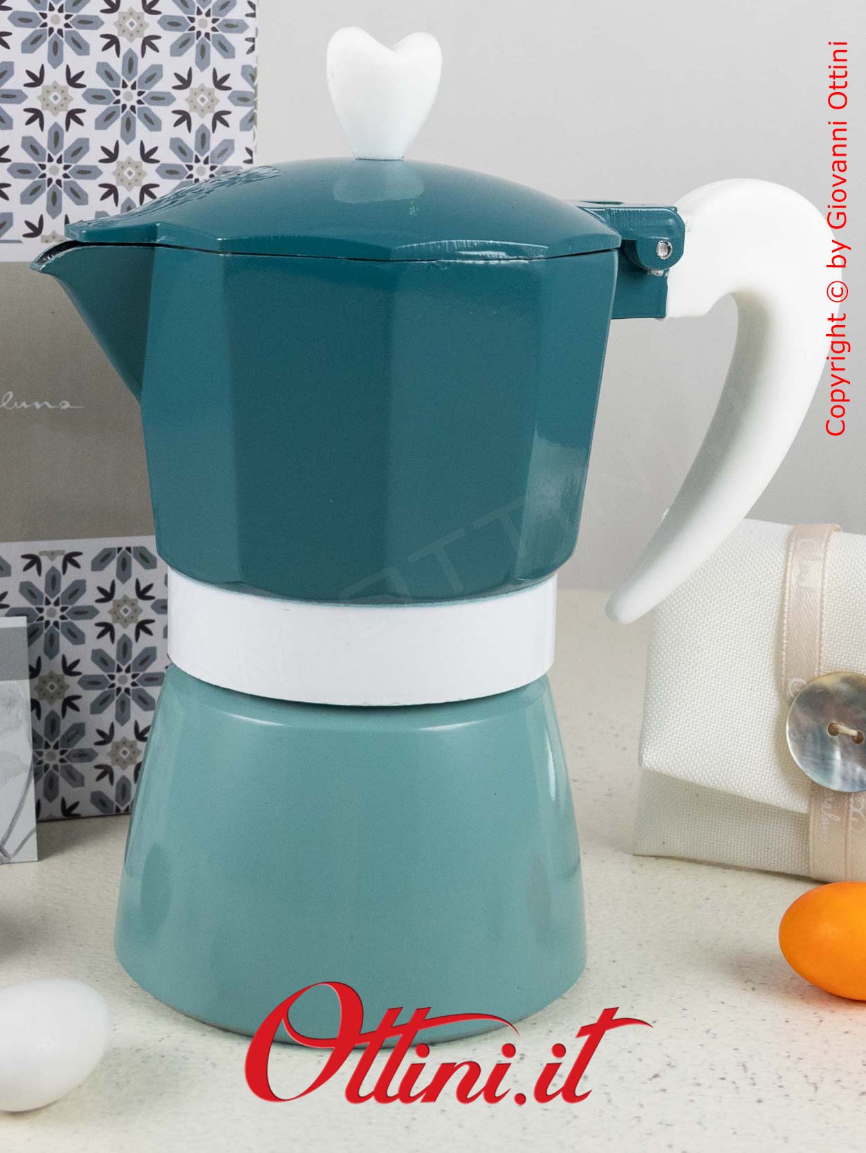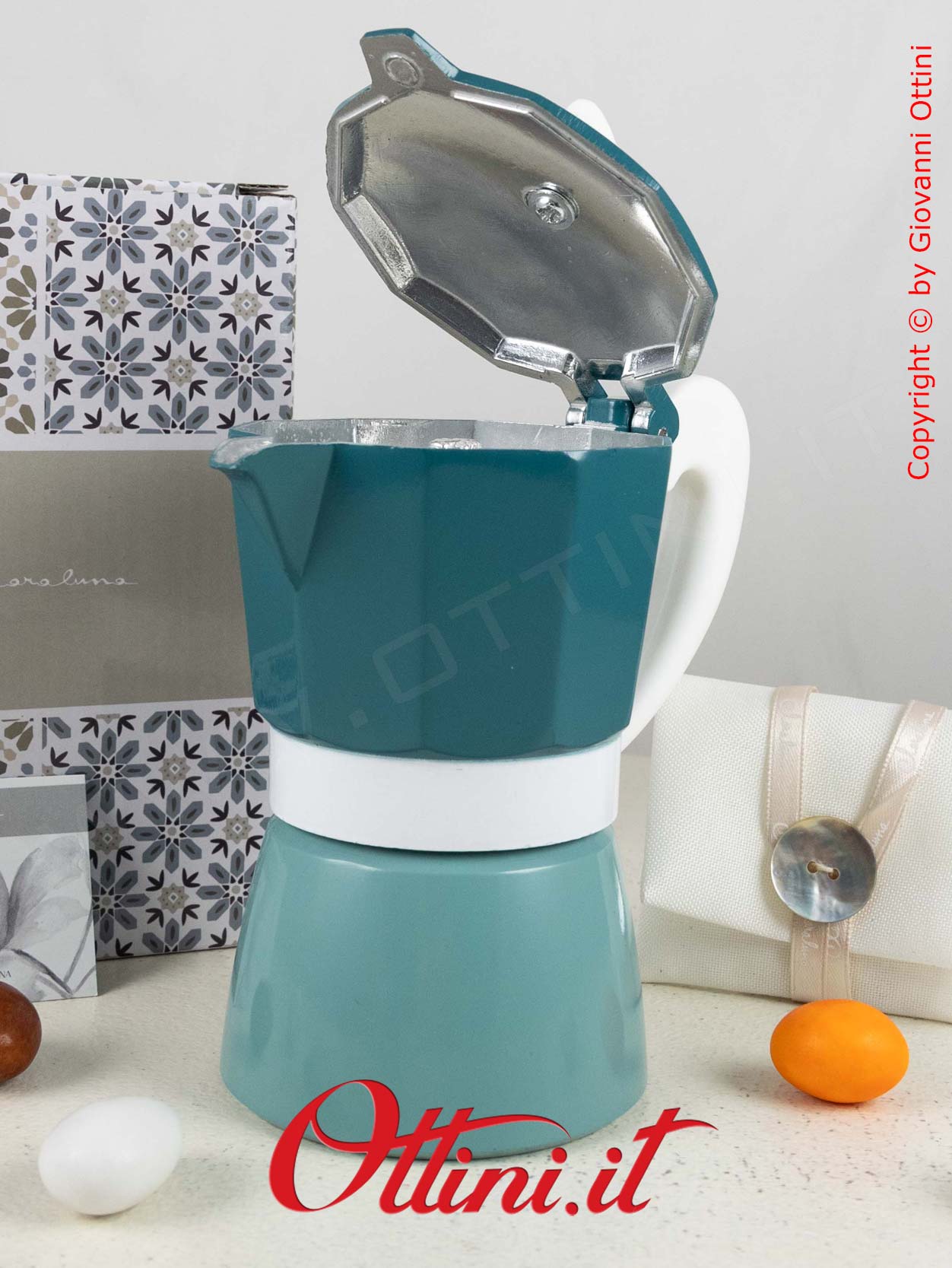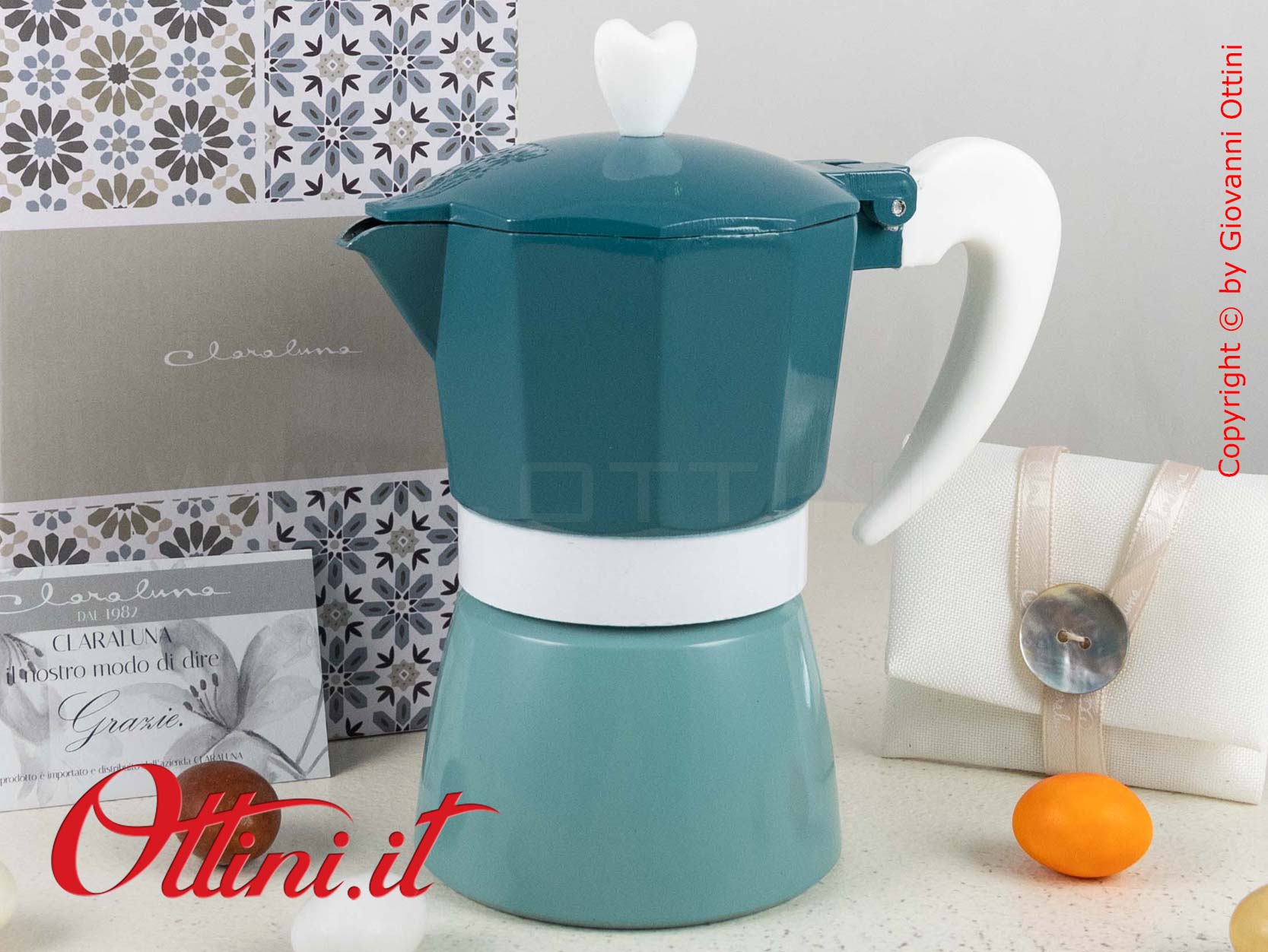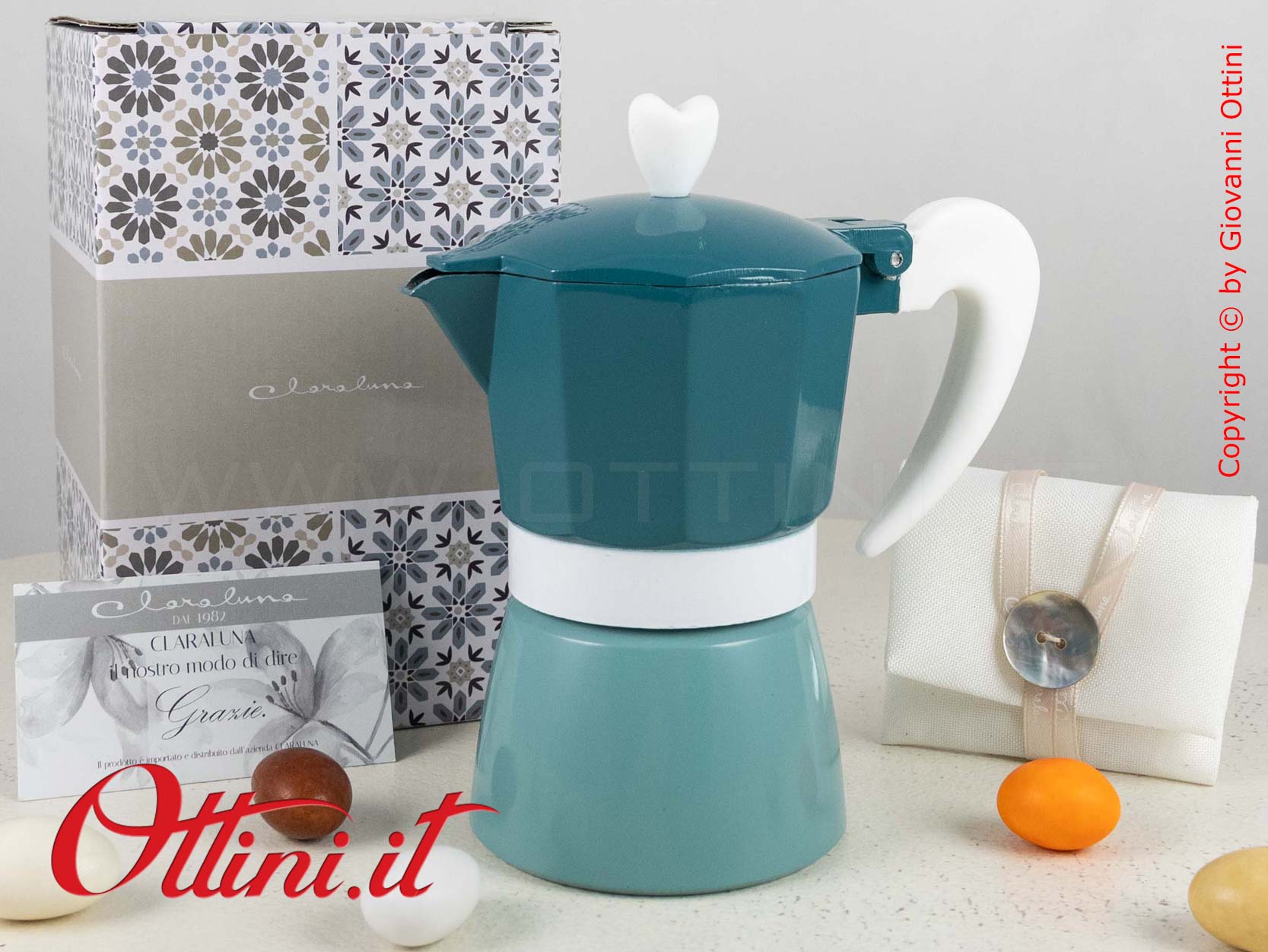 La pausa caffè deve essere un momento di relax e convivialità, meglio se in compagnia delle persone care… e godetevi anche questa nota di colore che vi regala questa splendida caffettiera moka color ottanio da 2 tazze di Claraluna. Le misure di questo oggetto sono di cm 13,5 di larghezza (compreso il manico) x 14,5 di altezza e 7,5 di profondità.