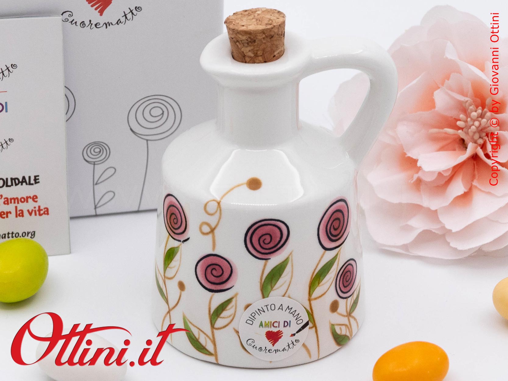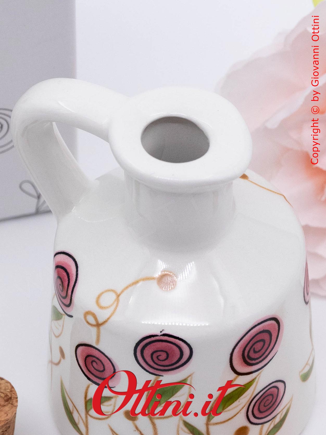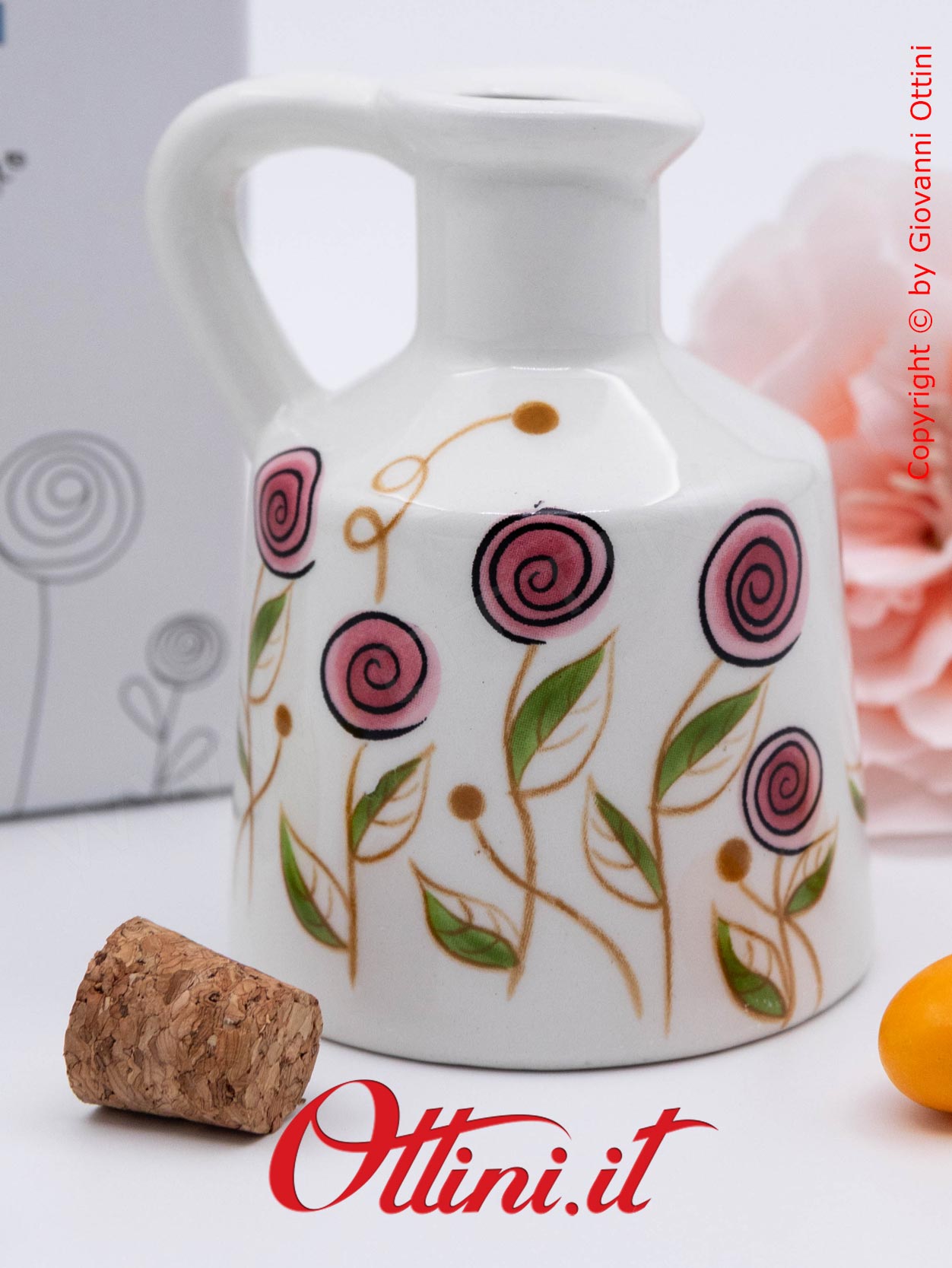 Colori delicati e un design dal sapore retrò per portare un po’ di colore a tavola: l’oliera piccola in ceramica stampata con fiori bocciolo rosa di Cuorematto è un prodotto utile ed elegante. Intorno alla tavola accogliamo le persone più importanti della nostra famiglia, gli amici del cuore, coloro che rappresentano la nostra felicità. Tutto quello che offriamo a loro merita il meglio anche nella presentazione. Un oggetto per valorizzare l’impegno di chi, con amore, cucina per noi ogni giorno. Gli amanti delle cose utili e funzionali, anche eleganti, soprattutto se destinate all’uso quotidiano, sono in continua crescita e cercano soluzioni adatte alle proprie esigenze. Cuorematto ha puntato molto su questa linea di articoli, cercando soluzioni “nuove” nel contesto della regalistica di eventi, che sia un matrimonio o un anniversario, e gli ha dato colore, solarità, fantasia! La grafica floreale dalle tinte delicate, si integra molto bene nell’arredo di qualsiasi cucina.