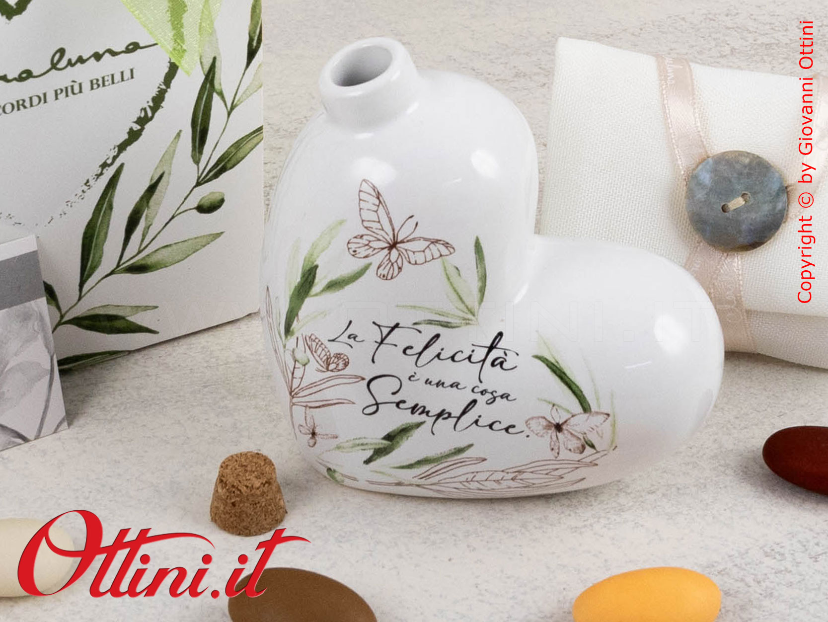 La tendenza alla regalistica utile che ha orientato le proposte dei principali produttori negli ultimi anni, è stata recepita in modo costruttivo da Claraluna che ha realizzato prodotti esclusivi e originali nel design: l’oliera piccola a cuore con tappo in sughero, è un esempio riuscito di questo settore. Realizzata in porcellana bianca smaltata è valorizzata da una stampa floreale con foglie di ulivo e farfalle, sarà un complemento elegante, un valore aggiunto alla tavola dei vostri invitati. Claraluna ha puntato molto anche sul lato emozionale con frasi e aneddoti che troverete stampate sul prodotto: “La Felicità è una cosa semplice” è quella che troverete su questa oliera.
