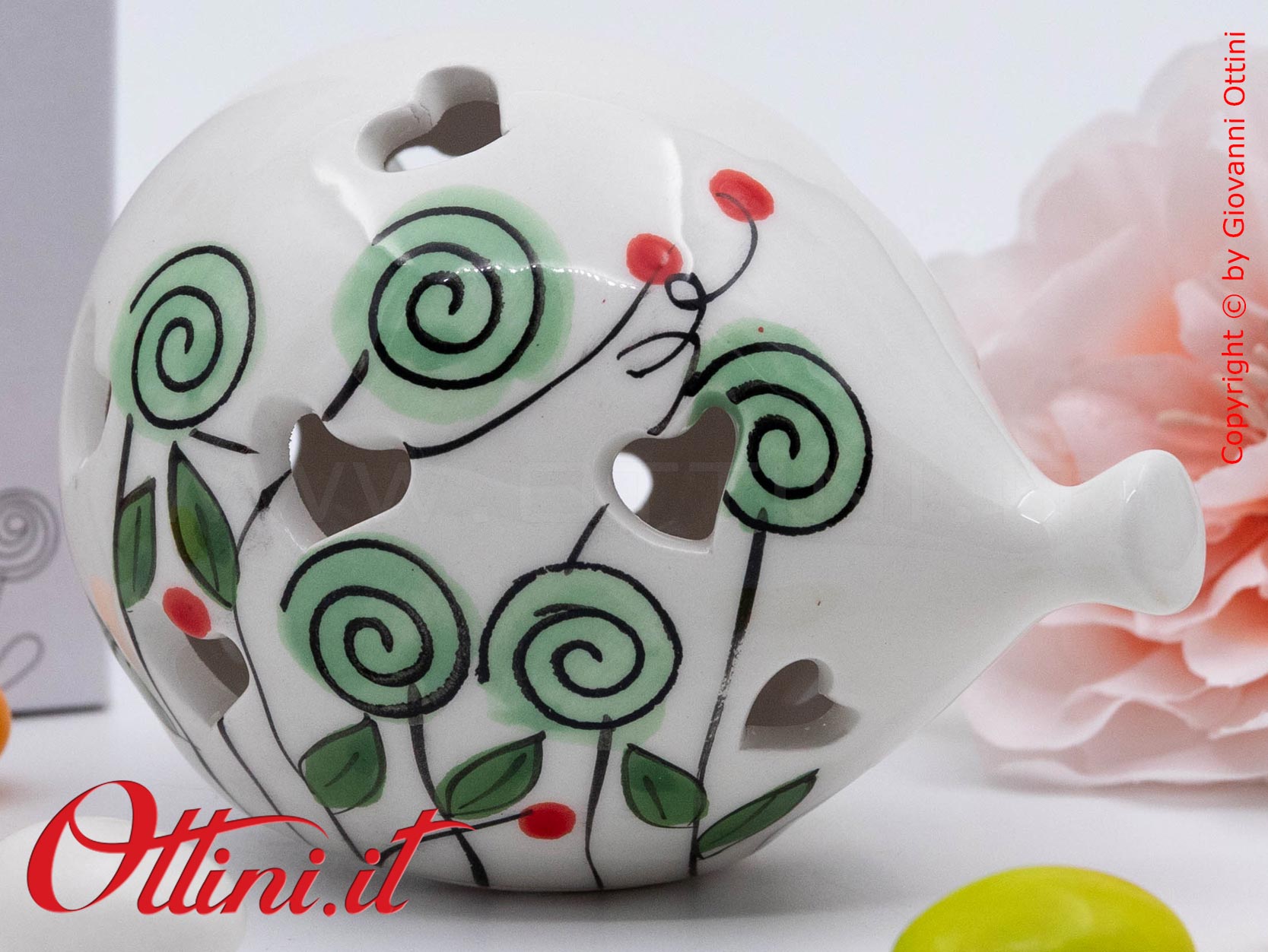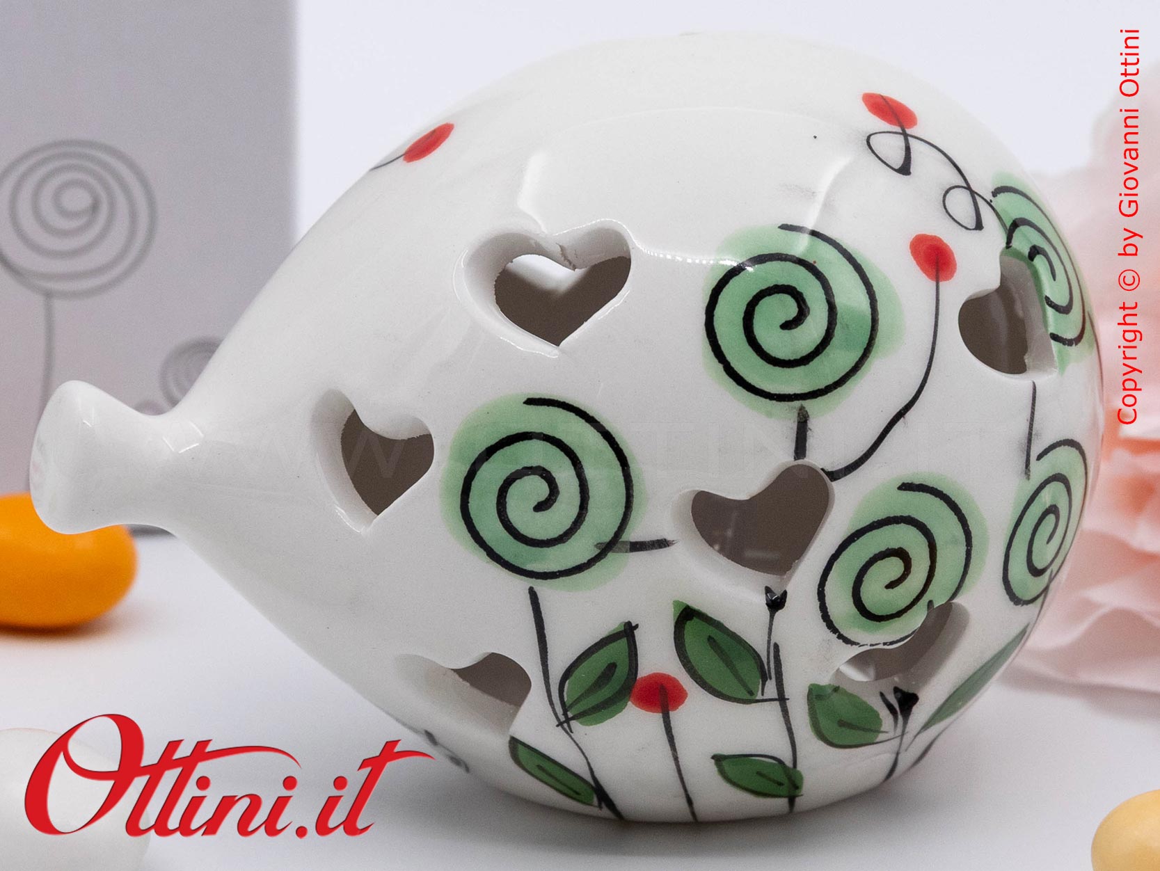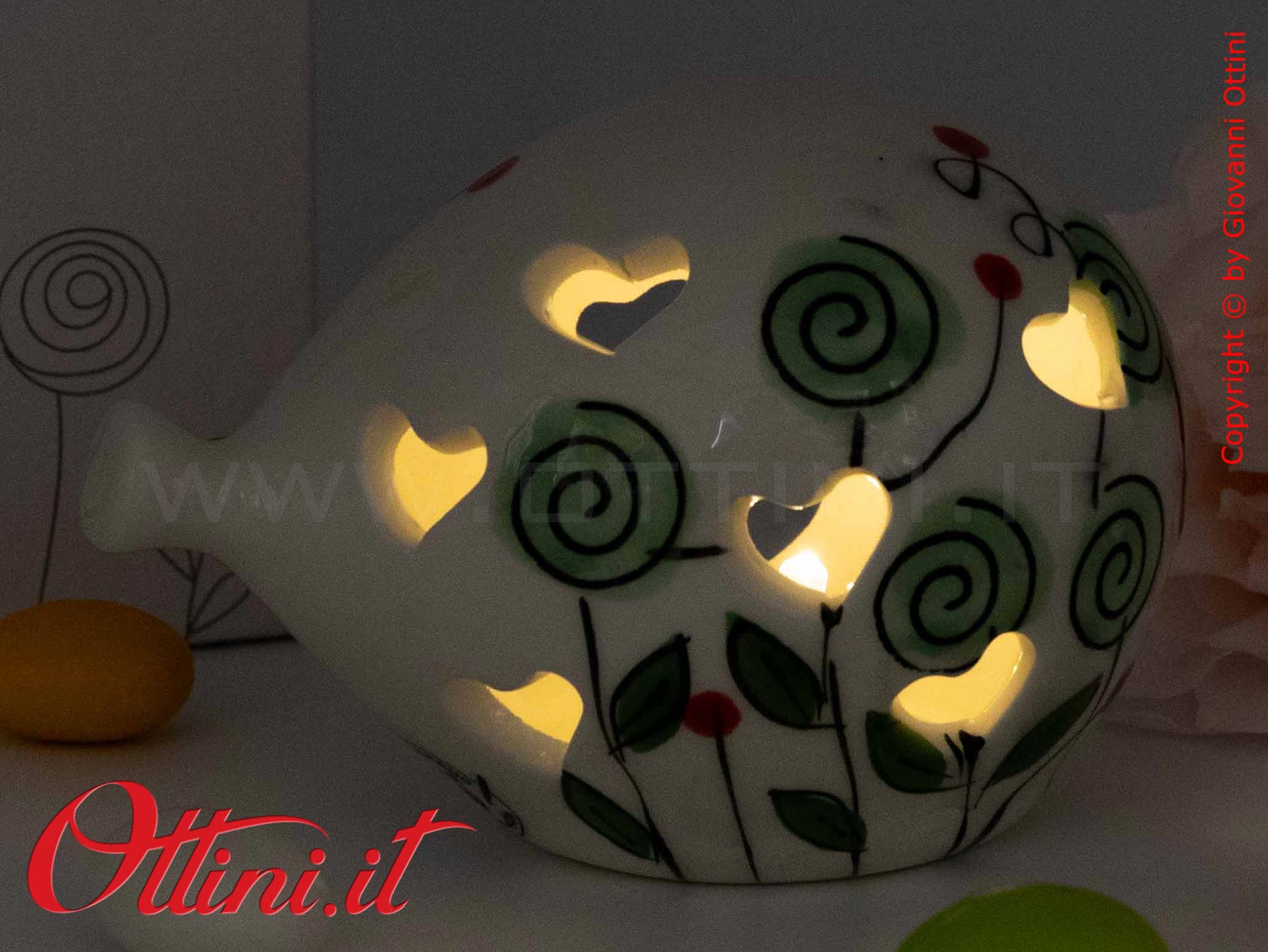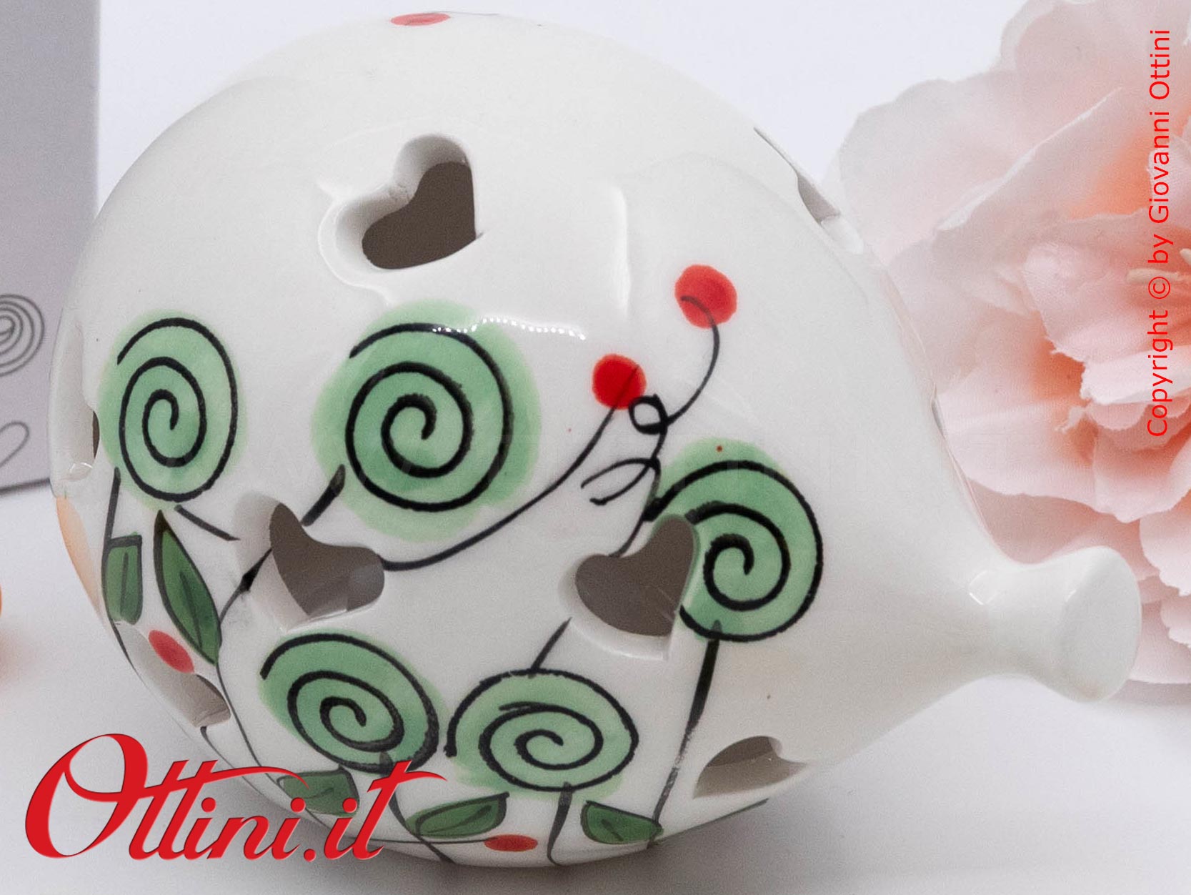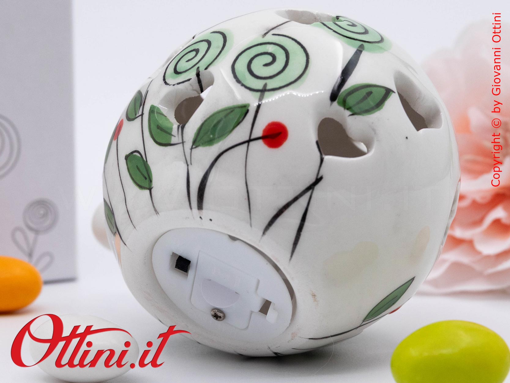 Il Palloncino è simbolo della leggerezza e Cuorematto, negli ultimi anni, ha dedicato a questo oggetto tante versioni colorate. Realizzato in fine portellana bianca smaltata, il palloncinio con luce led interna ha un decoro floreale con bocciolo verde. Alimentato a batterie (incluse), è da considerarsi una lampada decorativa notturna. Ideale per gli eventi dei più giovani, dai battesimi alle cresime.