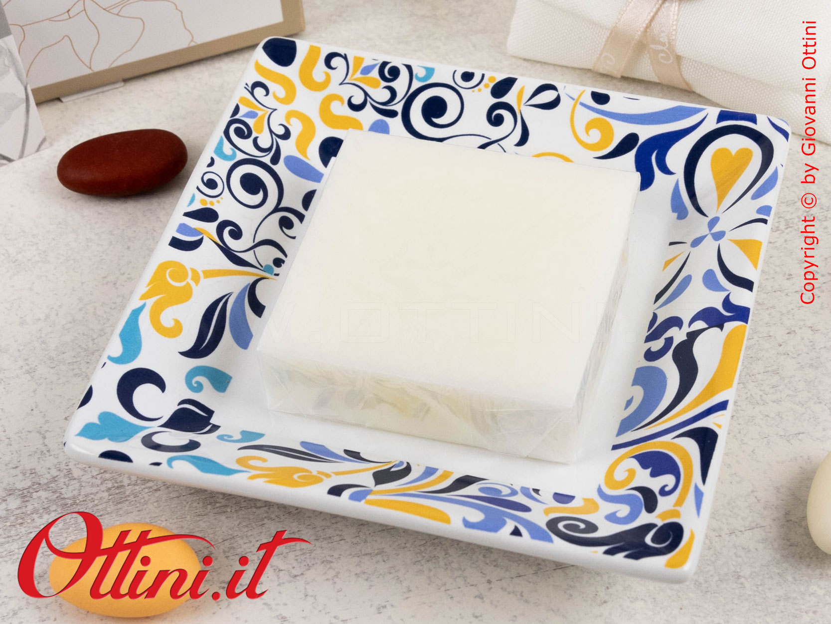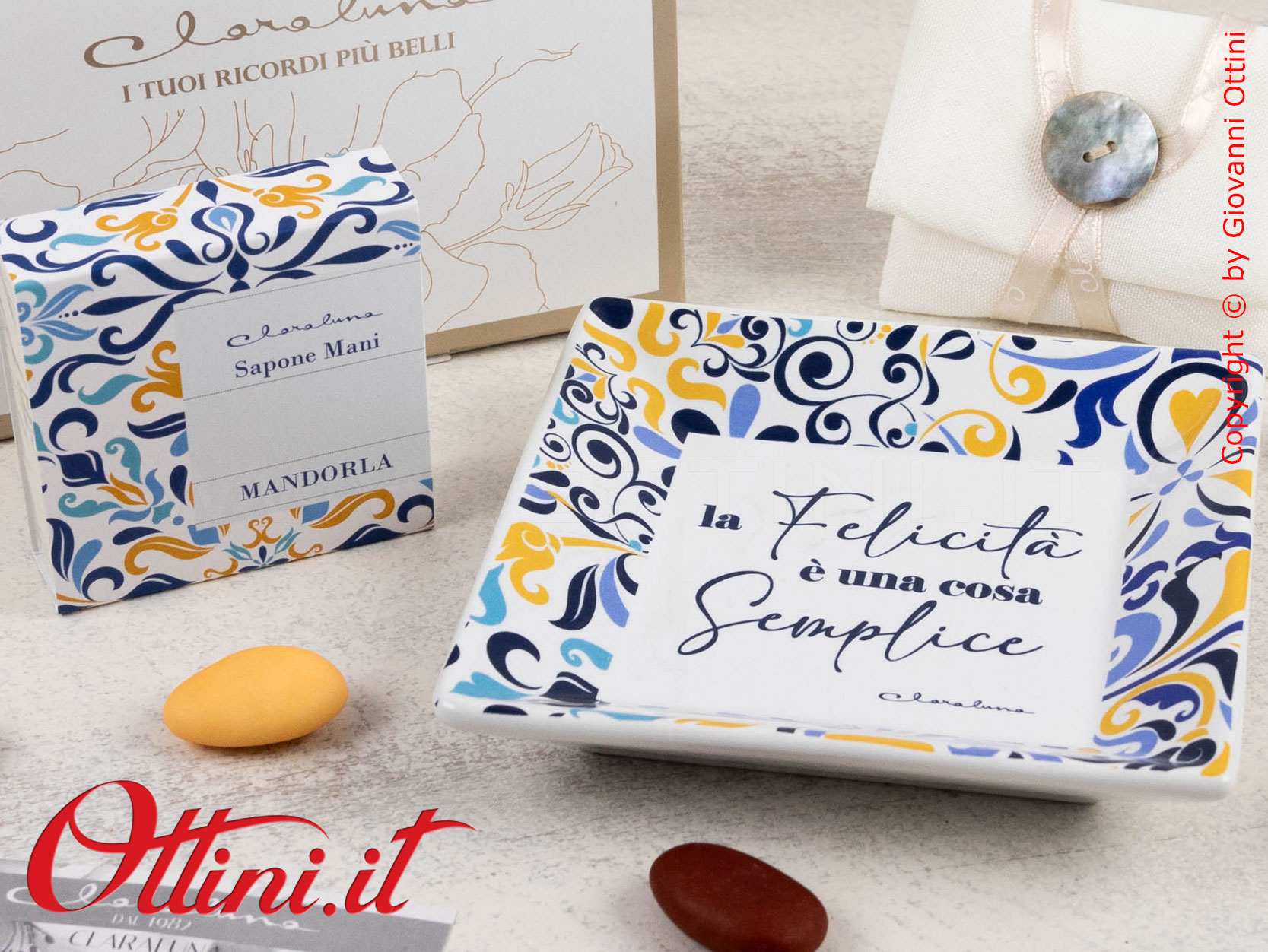 Piattino in porcellana smaltata con disegno Maiolica, completo di sapone profumato alla Mandorla. I colori delle maioliche siciliane, il messaggio “La Felicità è una cosa semplice” stampato sulla base, i profumi dell’essenza contenuta nel sapone, sono le caratteristiche che rendono questo articolo estremamente particolare. Nel panorama delle proposte di “bomboniere utili”, questa è un pochino insolita rispetto al notevole assortimento di quelle per la cucina o l’arredo, ma sarà probabilmente molto apprezzata a fianco di un lavabo che tutti utilizziamo più volte al giorno. E’ interessante la versatilità di questo piattino… ci sarà chi lo preferisce come svuota tasche o porta caramelle… Le misure sono di cm 11,5 di lato x 1,5 di spessore.