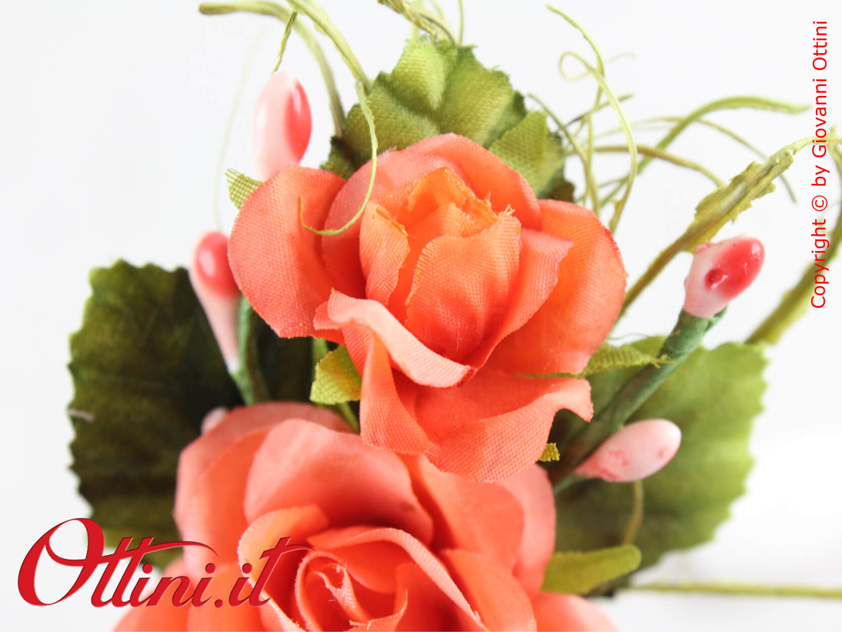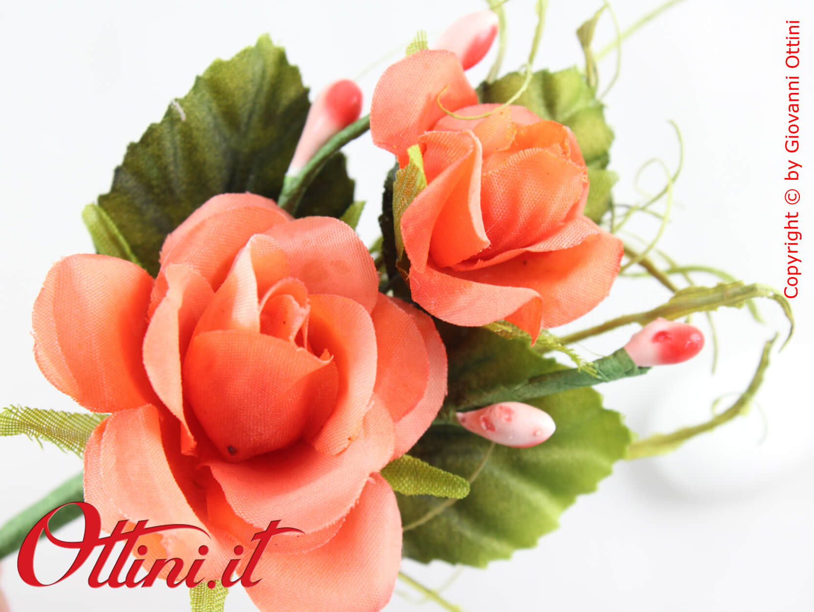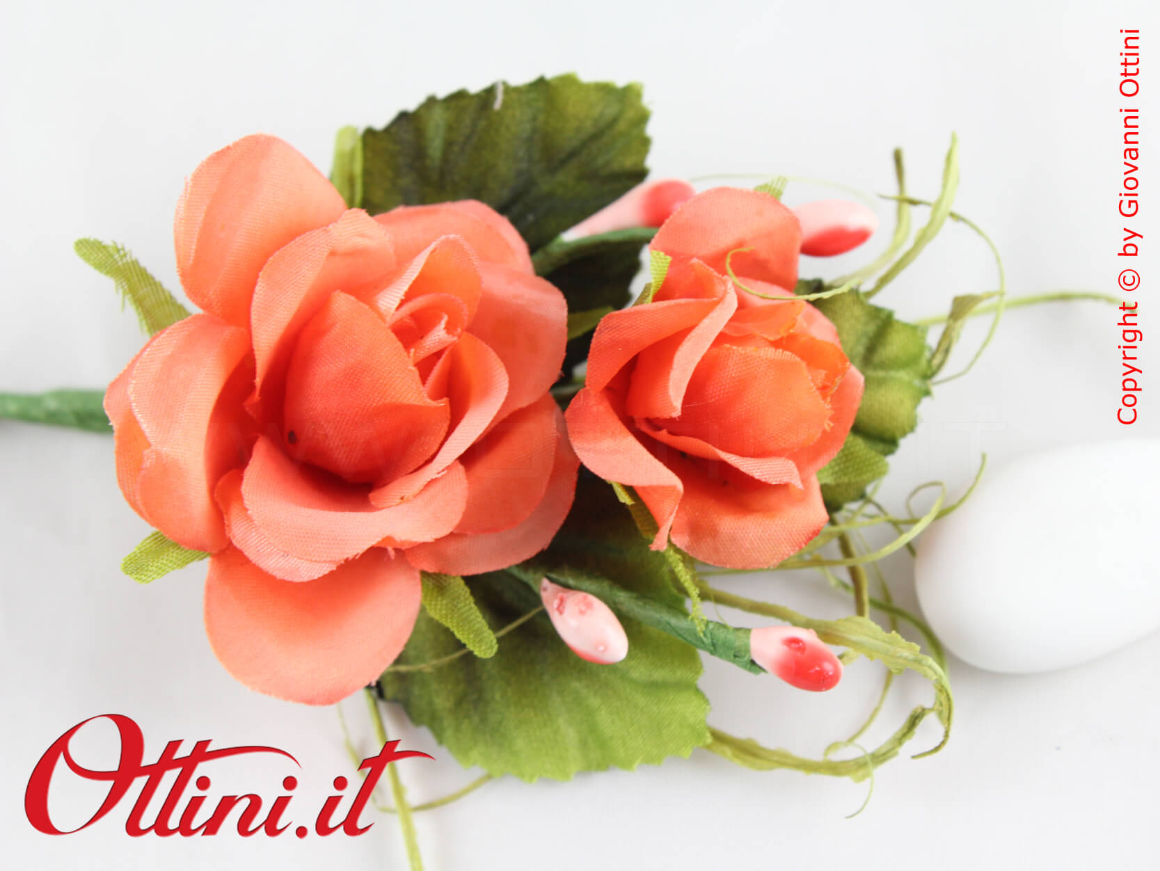 Il Pick Fiore Roselline Arancio è una composizione molto elegante composta da due roselline con foglie sul retro e decori verdi e arancio. E’ un fiore decorativo ideale per la confezione di scatole e sacchettini e con un’ottima resa coreografica. Si abbina a tutti i tipi di nastri dai colori vivaci.