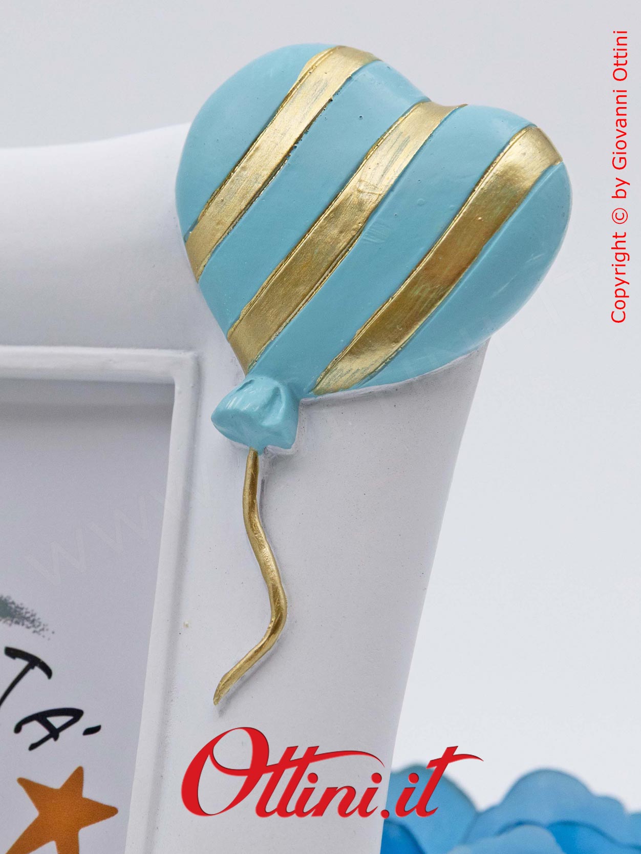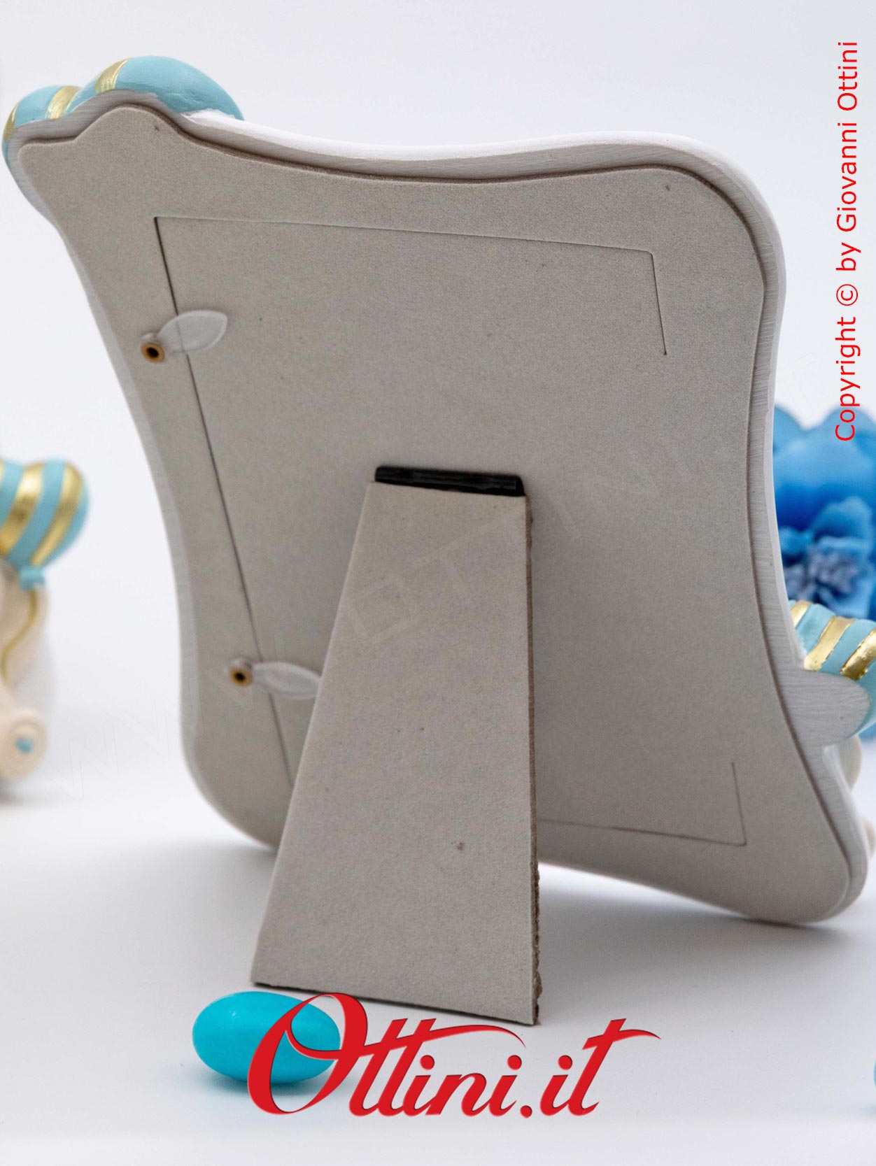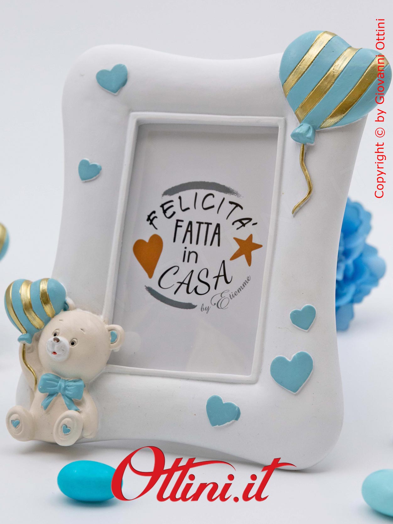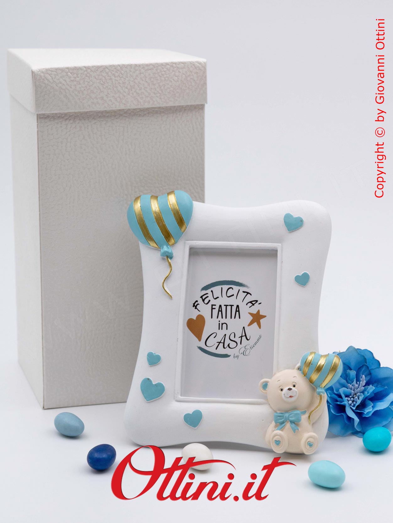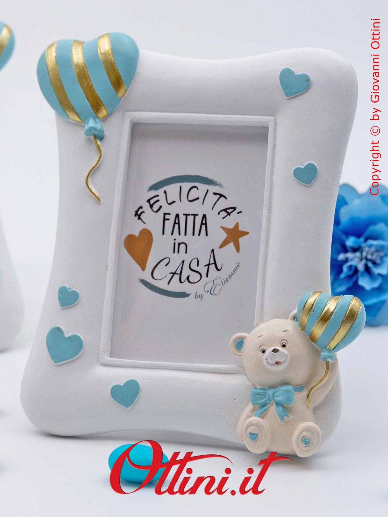 Ci sono momenti e persone speciali che vogliamo conservare per sempre, di essere valorizzate, che ci emozioneranno ogni volta che le vediamo. Questo bellissimo portafoto (formato grande) della serie “Orso Pupo” con fiocchetto celeste è realizzato in resina finemente decorata. Disponibile in due versioni, viene venduto in modo assortito: se ne comprate solo uno vi manderemo un modello a caso, se ne acquistate due riceverete un modello per tipo. Al suo interno accoglierà il sorriso della persona che amiamo in una foto di cm 9×13 ed è un’ottima idea regalo per nonni, padrini e madrine, o semplicemente da tenere in famiglia. Questo portafoto ha una lamina di pvc trasparente a protezione delle foto e sostituisce il classico vetro.