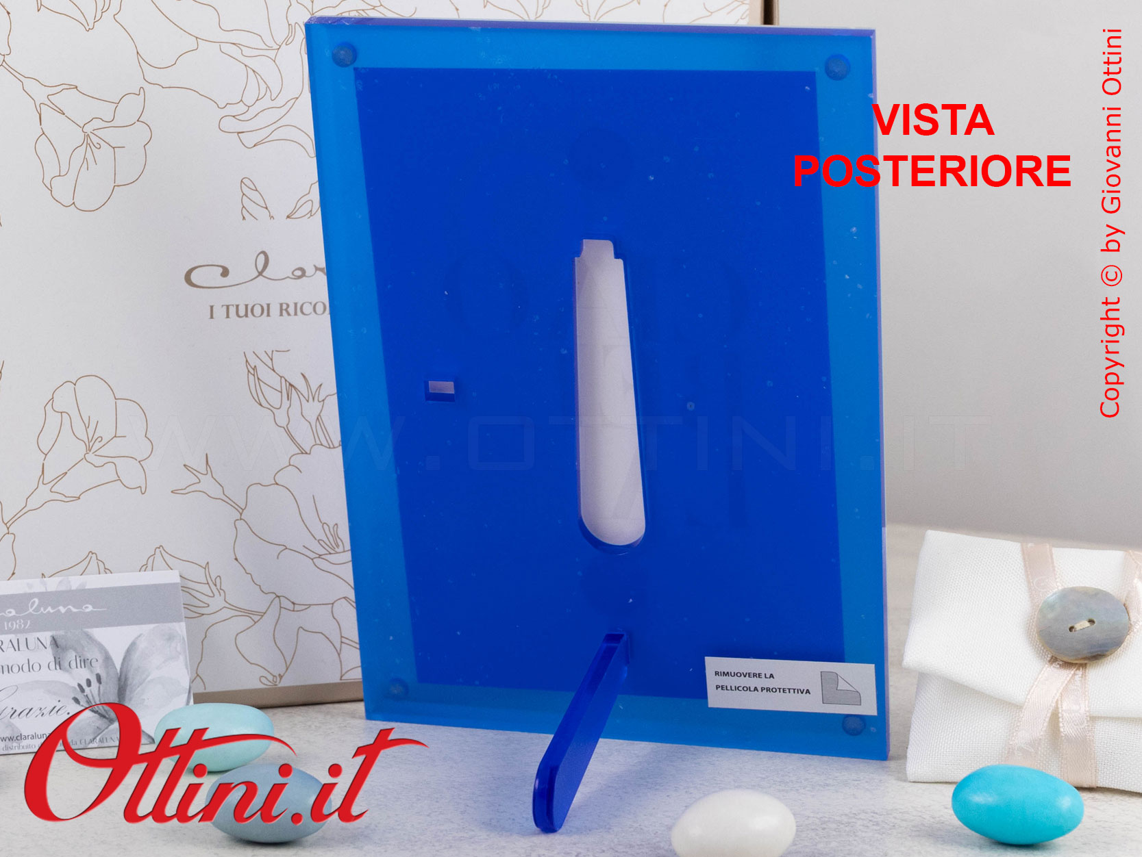 Ci sono momenti speciali che hanno bisogno di essere immortalati per sempre, di essere valorizzati, che ci emozioneranno sempre. Questo bellissimo portafoto realizzato in plexiglass BLU accoglierà il sorriso della persona che amiamo ed è un’ottima idea regalo per nonni, padrini e madrine, o semplicemente da tenere in famiglia. E’ composto da due lastre sovrapposte e unite con dei magneti incastonati negli angoli e conterrà una fotografia di cm 10×15. Una caratteristica molto utile di questo portafoto è la possibilità di essere posizionato sia in verticale che in orizzontale, perfetto per foto verticali e orizzontali. Le misure esterne sono di cm 12×17 di lato e 1 cm di spessore.