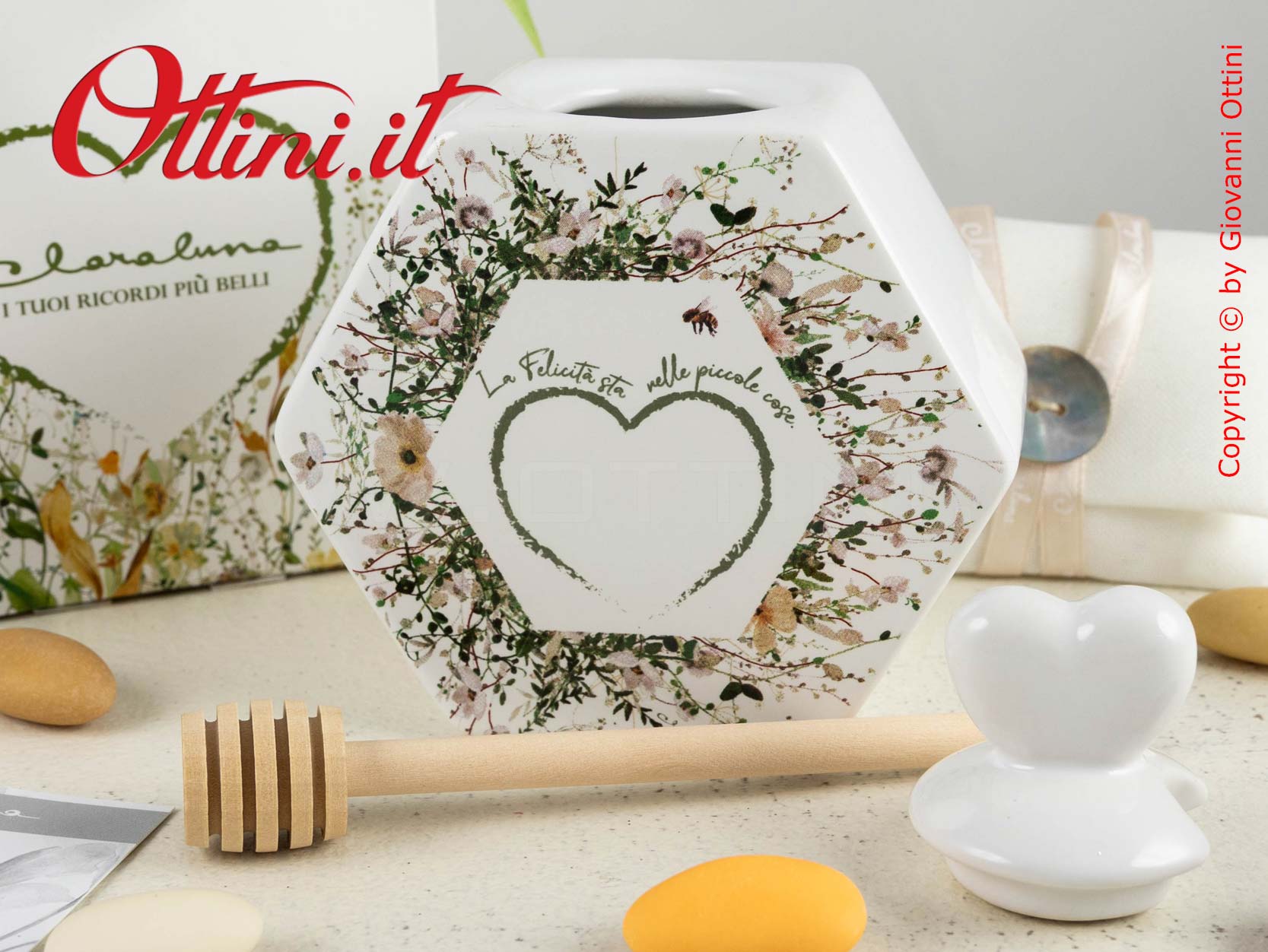 La natura è fonte di energia per gli occhi, la mente e anche per il palato!!! Claraluna ci propone questo bellissimo portamiele realizzato in ceramica bianca smaltata con stampa di colorati fiori nei toni delicati della primavera. Ogni contenitore è completo del suo coperchio e del relativo cucchiaino coglimiele che vi permette di raccoglierlo dal contenitore senza sporcarvi. Le bomboniere utili sono la soluzione ottimale per regalare dei prodotti che saranno molto apprezzati e usati nella quotidianità. Le misure di questo portamiele sono di cm 10 di larghezza x 12 di altezza e 5 di profondità.