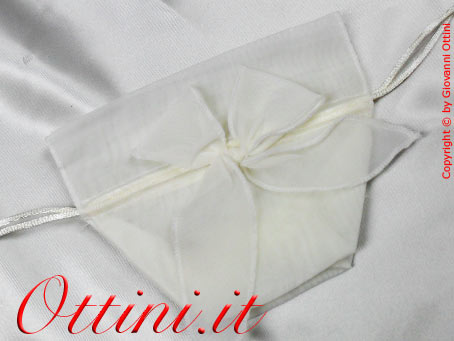 Splendito sacchetto in organzina color crema con fiocco. Il fondo è cucito con gli angoli ripiegati all’interno in modo da consentire una migliore stabilità una volta riempito con l’imbottitura ed i confetti. Sul davanti è applicato un fiocco del medesimo tessuto. I laccetti di chiusura in cordoncino del medesimo colore sono già infilati tra il doppio strato del tessuto: basterà tirare ai lati per poterlo chiudure con estrema facilità.