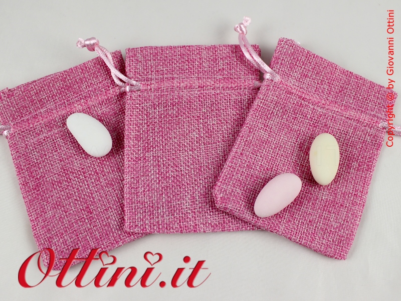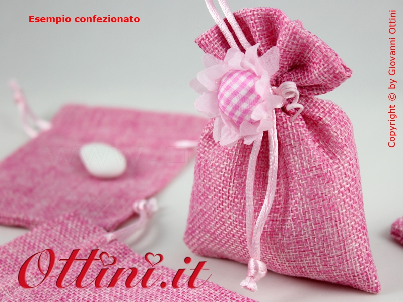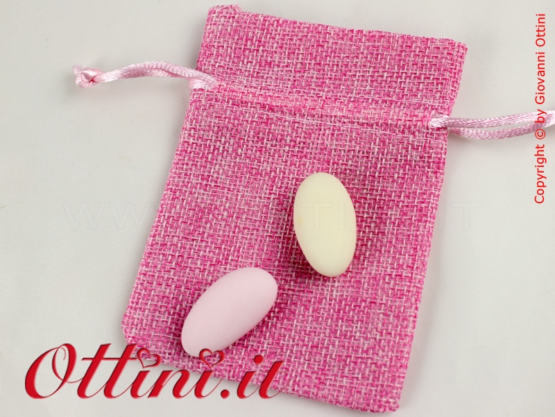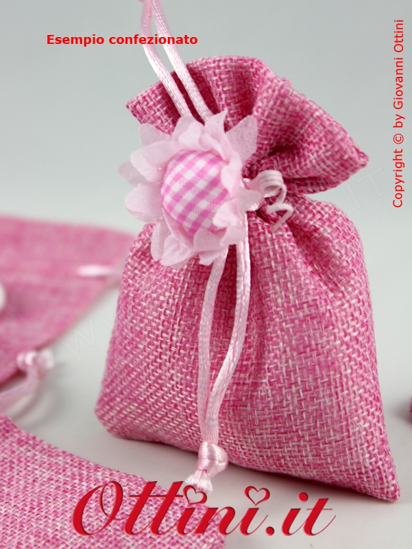 Morbido sacchetto in cotone antisfilo lavorato a trama grande con effetto juta. I cordoncini per la legatura sono già preinfilati per cui è sufficiente inserire i confetti o i vostri oggetti e tirare per chiuderlo.