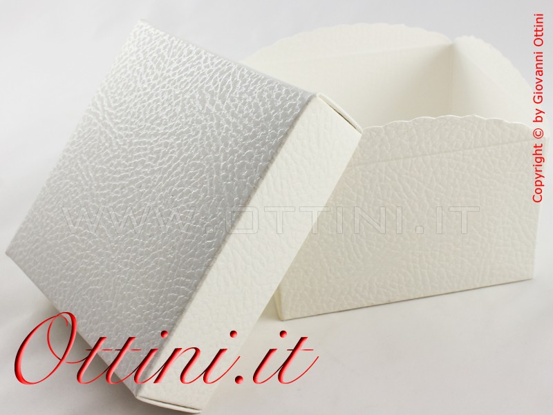 Scatola per confezione bomboniera con fondo rinforzato realizzato in cartoncino di ottima consistenza, spessore e grammatura, di qualità superiore. La superficie esterna che è lavorata a effetto Pelle, conferisce prestigio e raffinatezza. Il coperchio è staccato dalla scatola contenitore (ma compreso nel prezzo) e costituisce elemento indipendente. Questo vantaggio permette di ridurre e modificare l’altezza della scatola in base alle proprie esigenze. Sui bordi la scatola ha un bordino arrotondato che può essere piegato. Se non viene piegato, l’altezza disponibile è di cm 7 invece di 6.