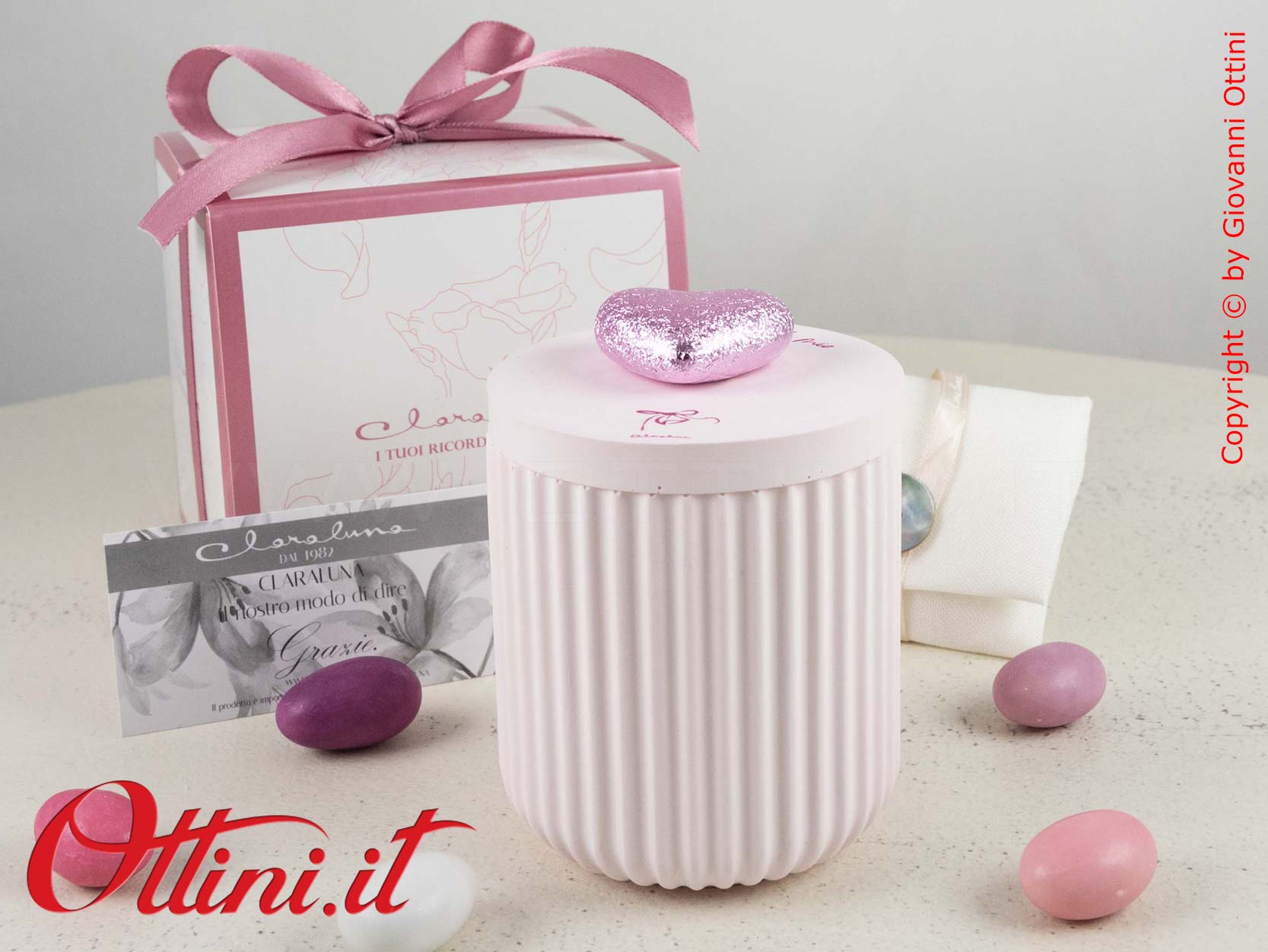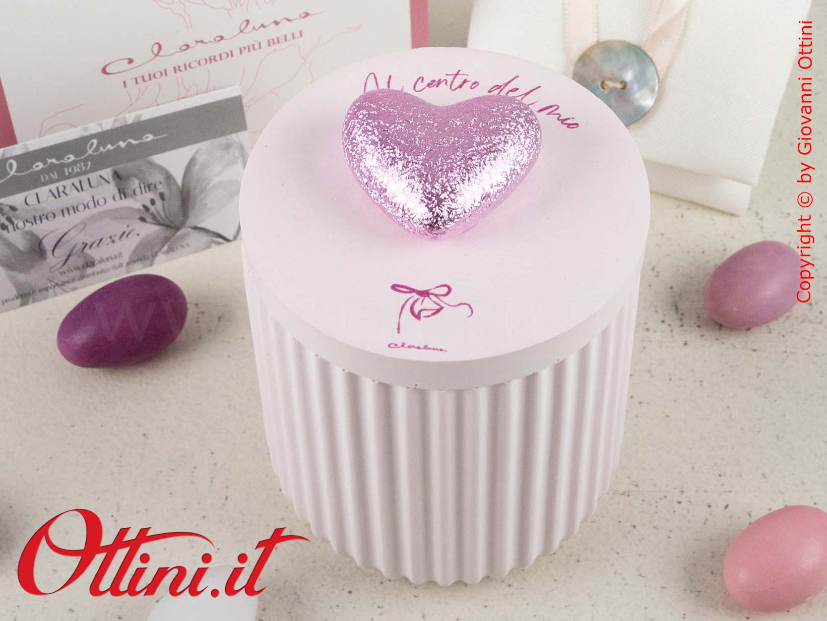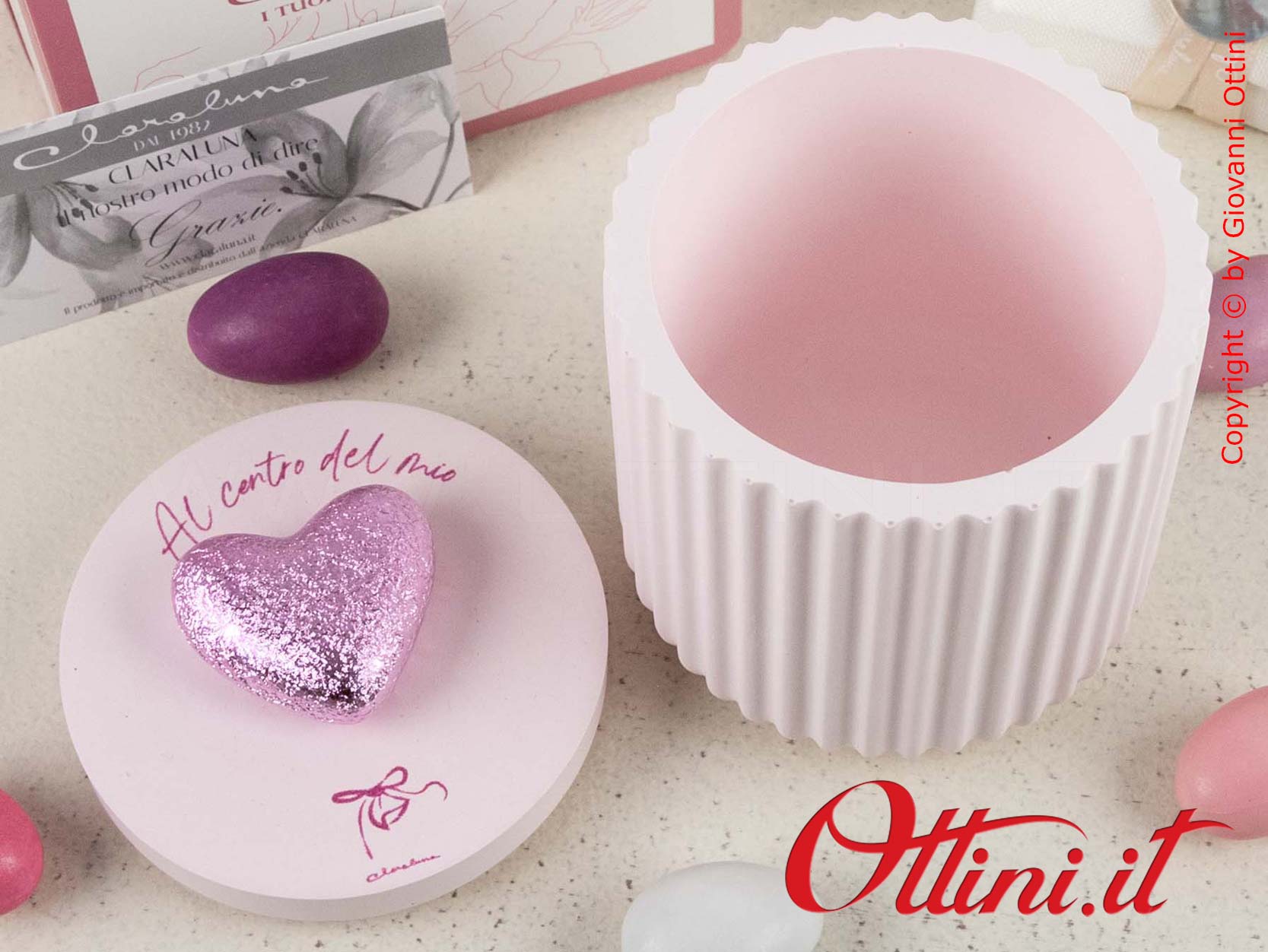L’eleganza e l’armonia di una casa comprendono anche l’atmosfera, il calore che ti trasmettono le persone e le cose che ci circondano. Claraluna ci propone questa bellissima scatola portagioie nella versione più piccola completa di coperchio con cuore rosa a finitura metallizzata satinata. Il contenitore è completamente realizzato in gesso con un design plissè che conferisce un aspetto vintage estremamente piacevole e adatto a qualsiasi tipo di arredo. Le misure di questo oggetto sono di cm 7 di diametro x 9,7 di altezza totale.