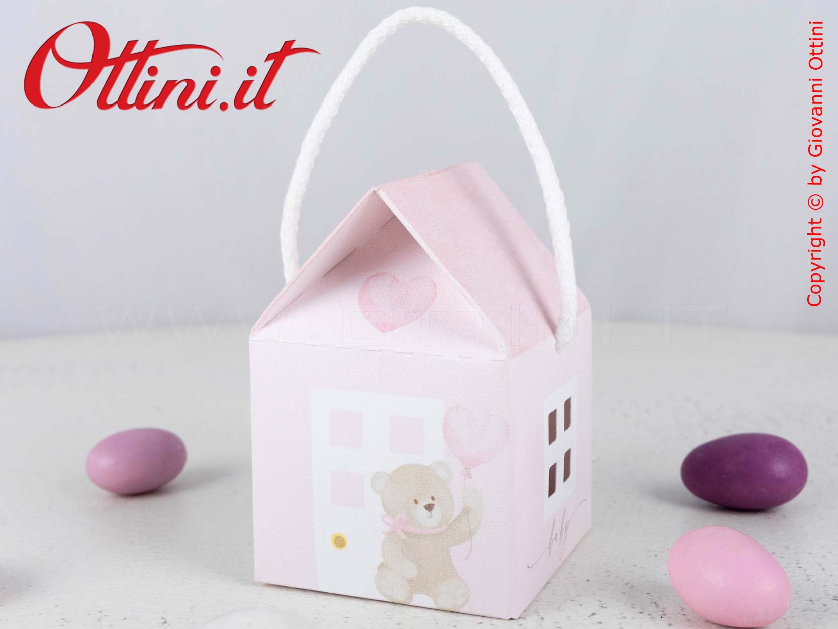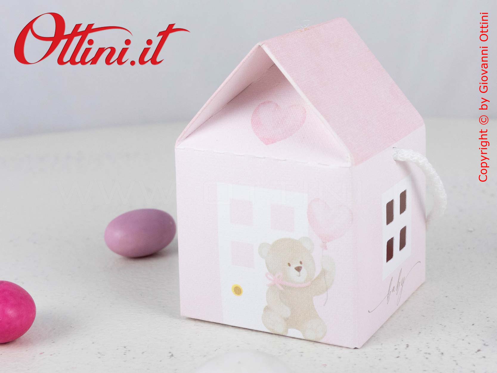 La qualità di un prodotto Made in Italy e un design originale sono le caratteristiche principali della scatolina portaconfetti a forma di Casetta Rosa con Orsetto di Scotton, azienda leader nel settore. Specifica per festeggiare nascite e battesimi, è un prodotto economico solo a livello di prezzo, ma di eccellente qualità, non impegnativo per chi la riceverà. Il montaggio è semplice e intuitivo e al suo interno ci stanno tutti i tipi di confetti che desiderate. Nel corredo trovate anche il cordoncino che vedete nelle foto e il sacchettino per alimenti in pvc cristal auto sigillante per i confetti (i confetti non sono compresi) che andranno inseriti all’interno, a garanzia del rispetto delle norme igieniche.