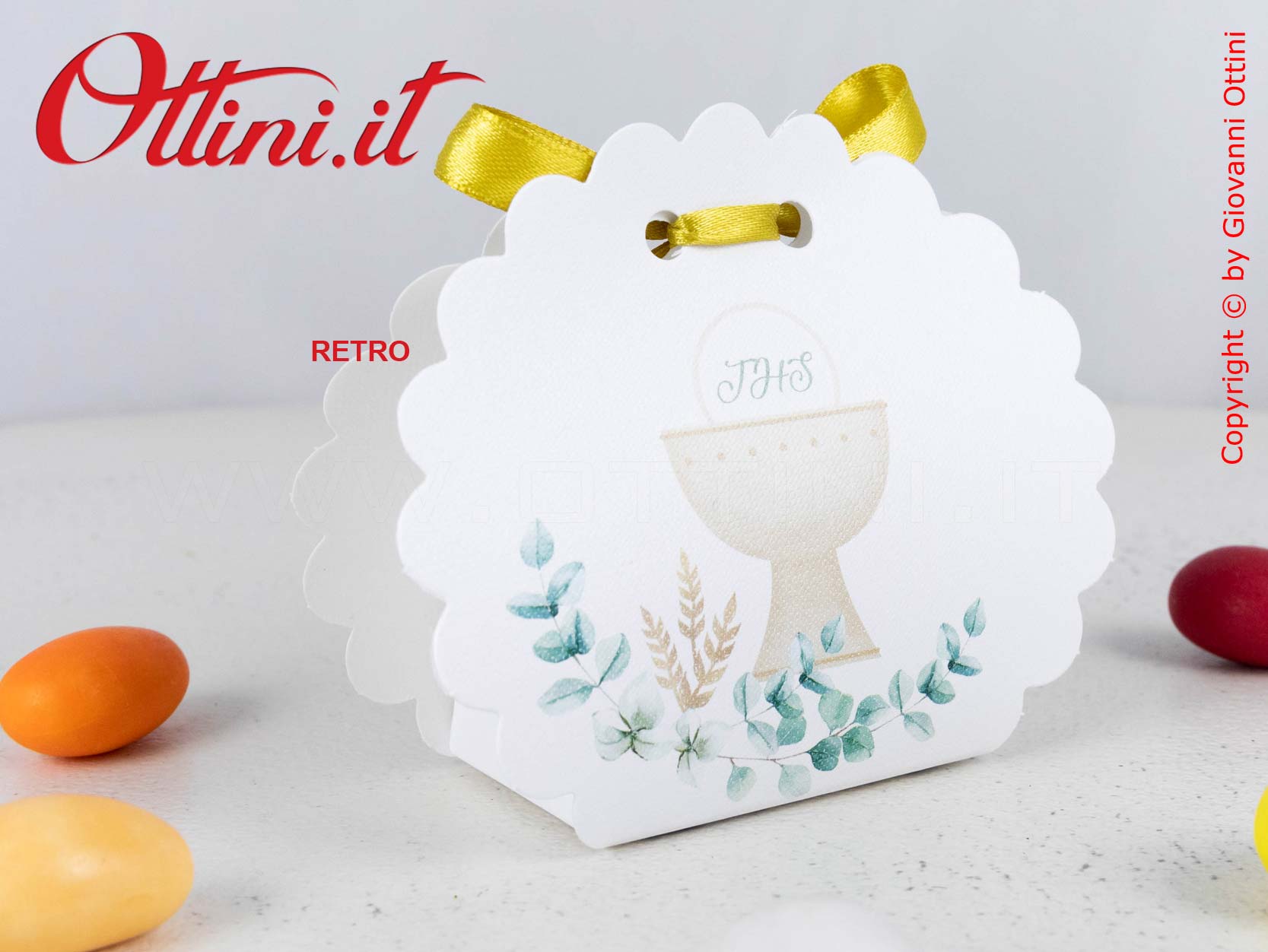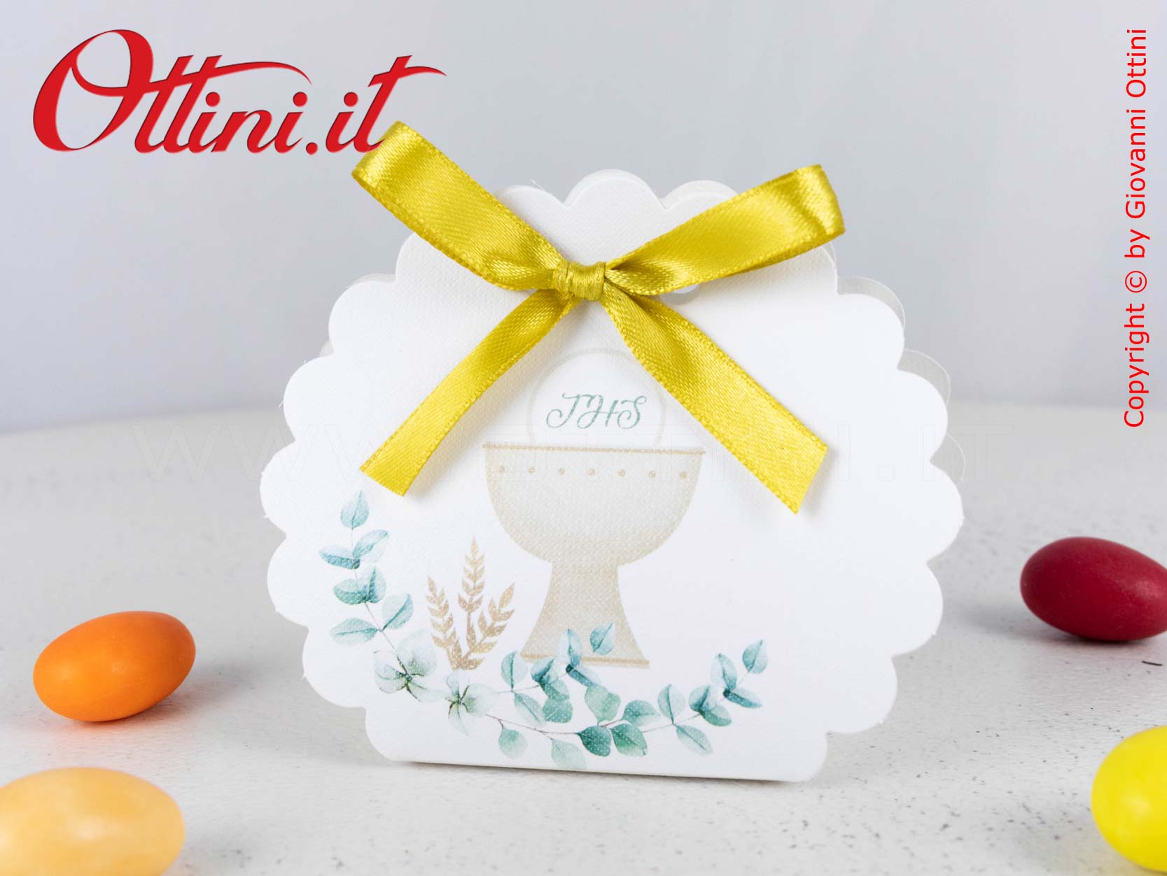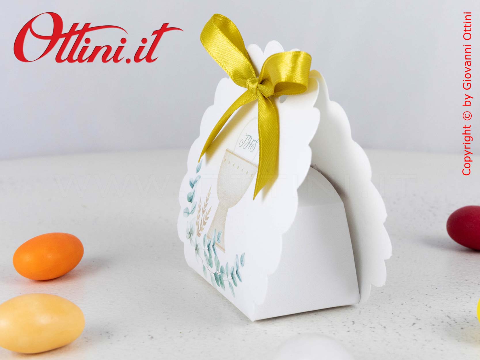Stupenda scatolina porta confetti in cartoncino di primissima qualità per Prima Comunione della linea Borsaro di Scotton, azienda italiana leader di settore. Specifica per tutti le Comunioni, sia bimbo che bimba, è caratterizzata dalla stampa del calice, simbolo di questo importante sacramento.