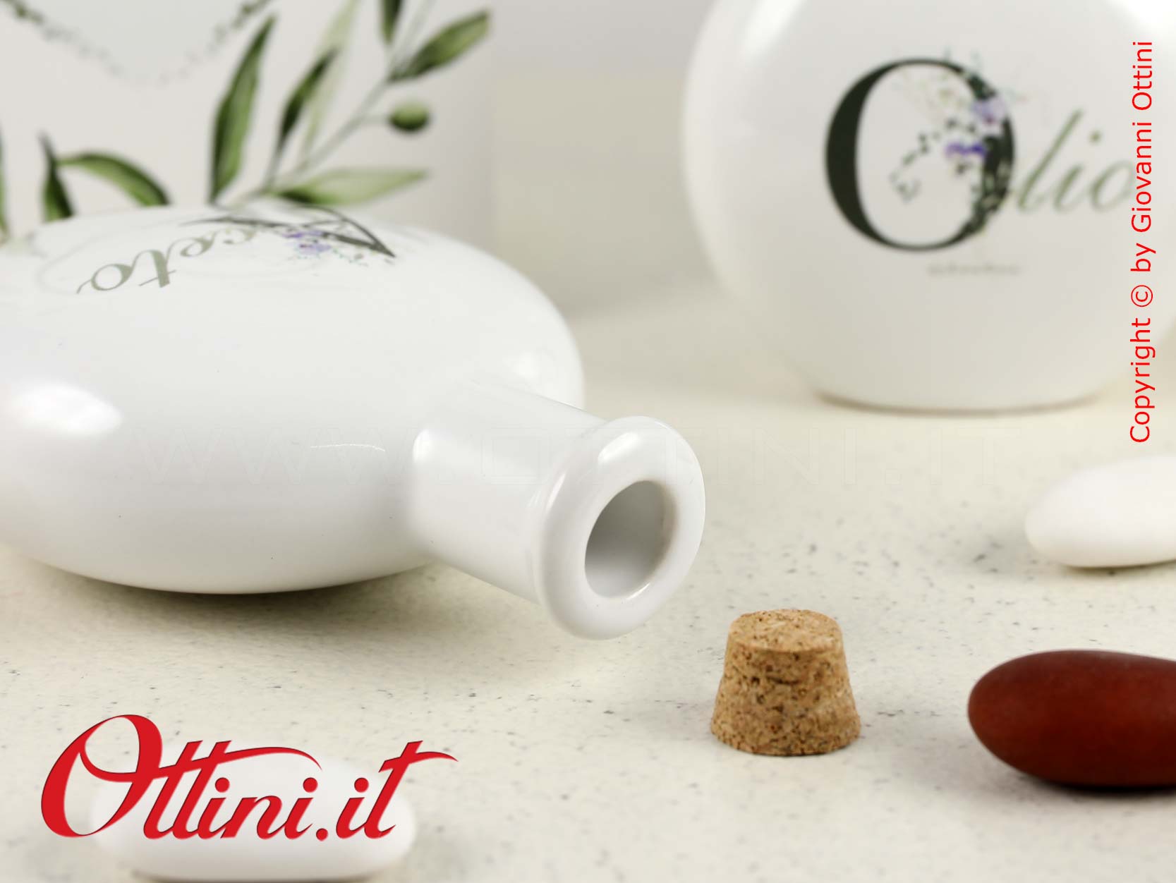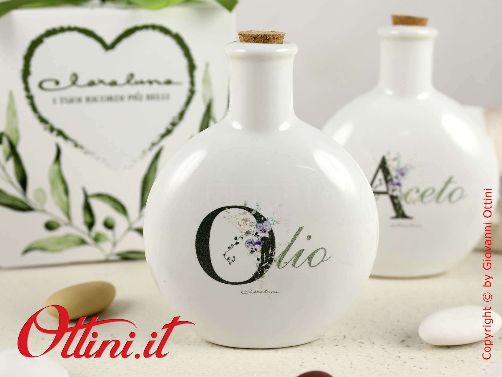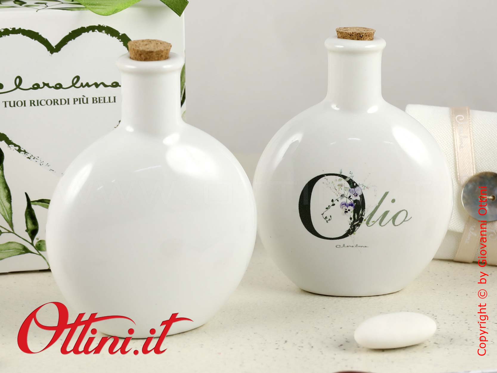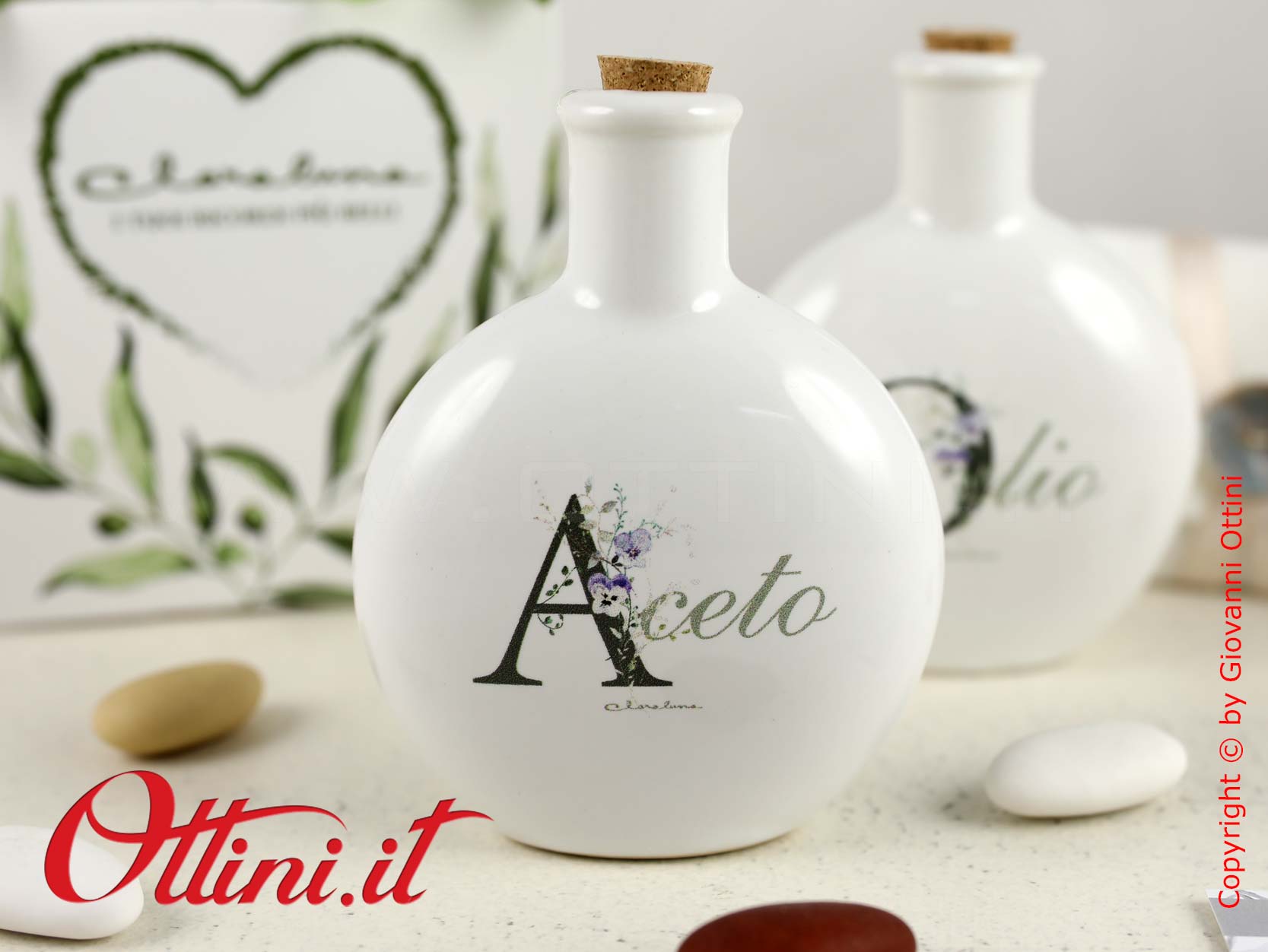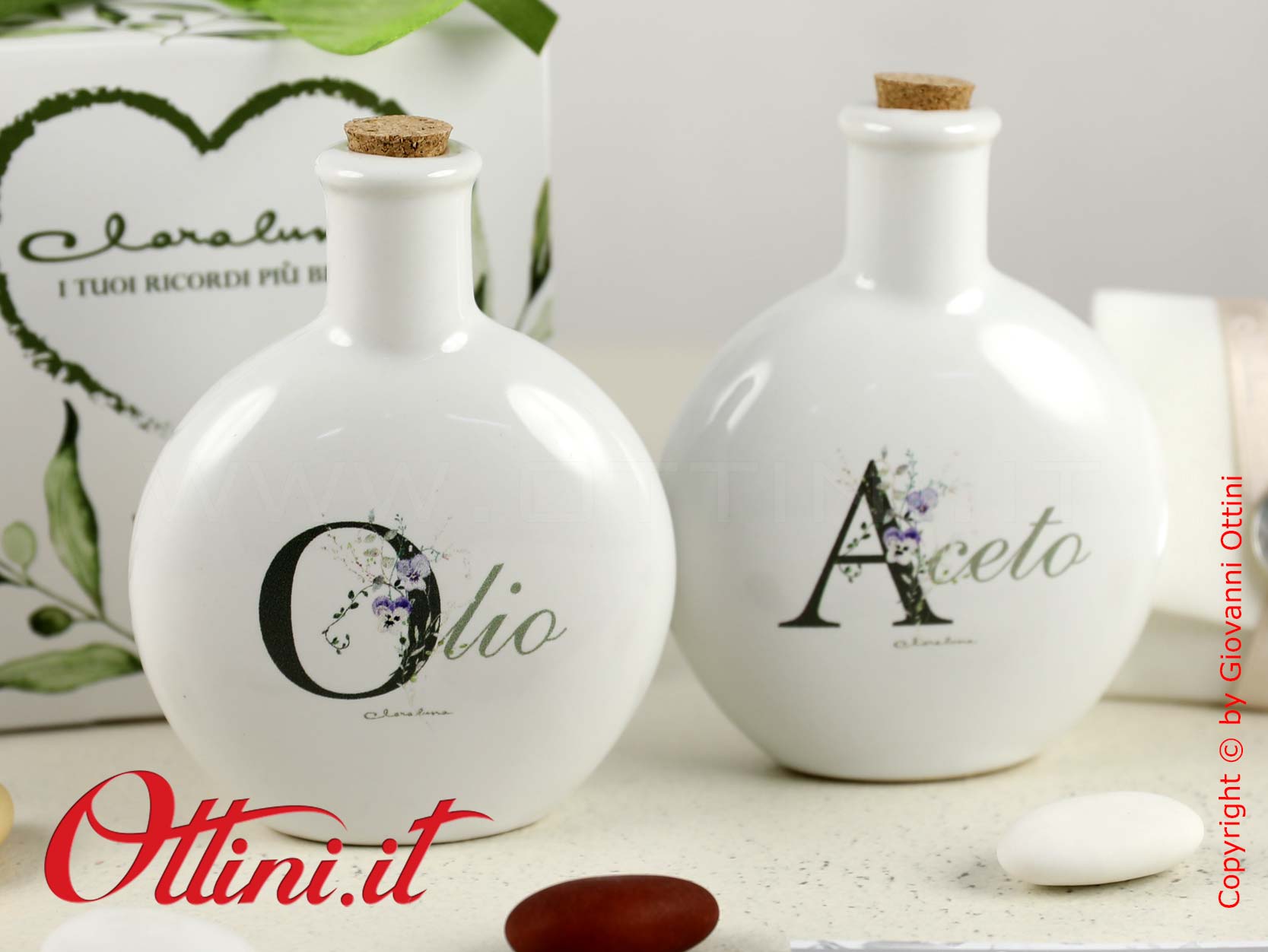 Set Olio e Aceto tondo in porcellana smaltata bianca e decoro floreale, completo di tappi in sughero. Un’idea originale per dare un tocco di personalità alla vostra tavola. Le bomboniere utili per la cucina sono la soluzione emergente in questi ultimi anni e sono in continua crescita le proposte che si orientano a questo mercato. La capacità di ogni contenitore è di 75ml, un formato ideale e non eccessivamente ingombrante sulla tavola.