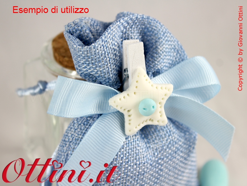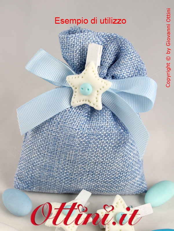 Mollettina bianca con applicazione di un decoro a forma di sellina in resina colorata. Particolarmente indicato per la confezione di bomboniere per nascita o battesimo bimbo. Le confezioni sono di sei pezzi. Il prezzo che vedete è di una confezione intera.