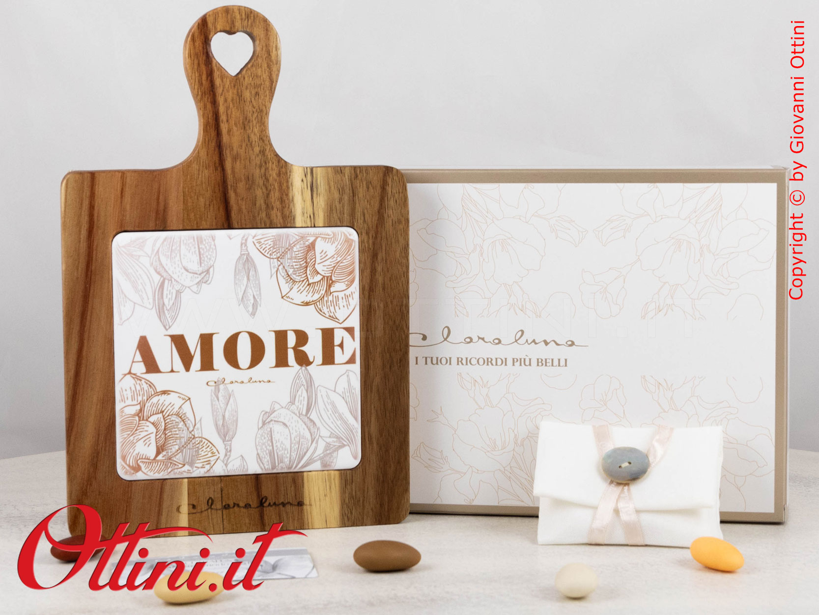 Tagliere in legno massello tinta noce con piastrella in ceramica con disegno floreale e la scritta “AMORE”. Le bomboniere utili sono le più richieste e in un panorama di proposte che spaziano dall’arredo (vasi, svuotatasche, ecc) al funzionale (profumatori e diffusori tra i principali), quelle destinate alla cucina, alla tavola e alla cura degli ospiti, sono le più vendute. Che sia poi utilizzato come un sottopentola o un simpatico “vassoio” su cui servire degli stuzzichini per un aperitivo, questo tagliere sarà utilizzato in tantissime occasioni.