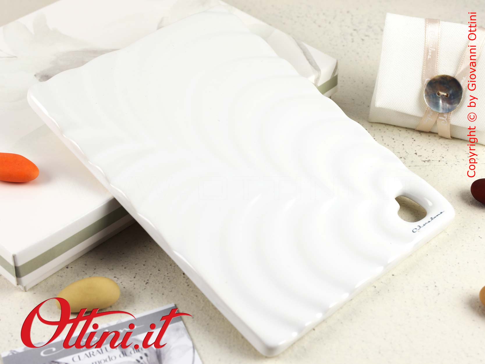 Elegantissimo tagliere piccolo con design a onde realizzato in porcellana bianca smaltata. Il formato è di cm 12,8x18x0,8 di spessore ed è disponibile in assortimento anche quello con coltellino per formaggi (24091), quello più grande con coltellino (24093) e quello più grande senza coltellino (24094). Ideale per servire formaggi o come vassoietto per stuzzichini per aperitivo, sarà il valore aggiunto nella presentazione delle vostre creazioni culinarie. Può essere un’idea originale per dare un tocco di personalità alla vostra tavola o alla vostra casa. Le bomboniere utili per la cucina e la casa sono la soluzione emergente in questi ultimi anni e sono in continua crescita le proposte che si orientano a questo mercato.