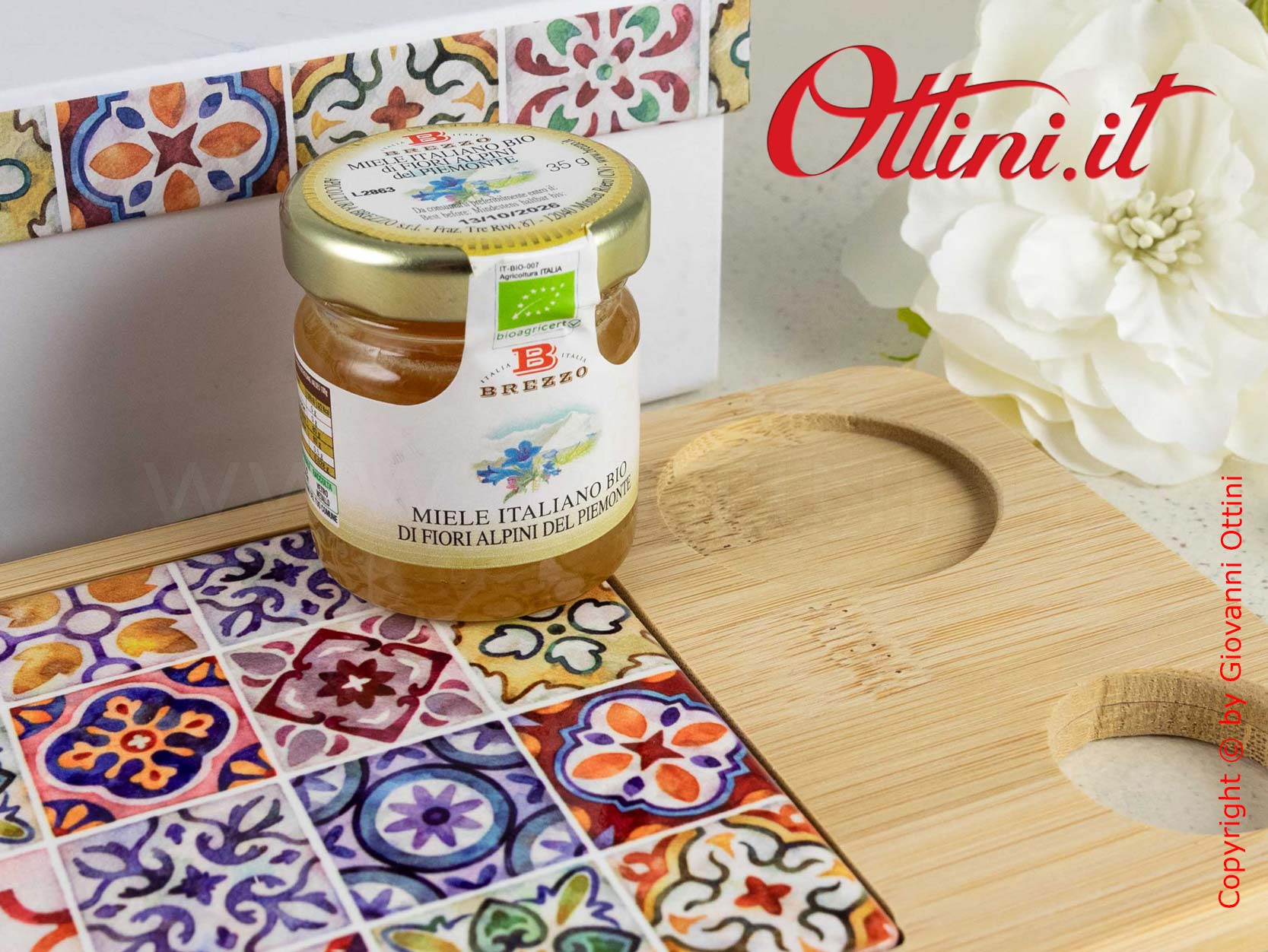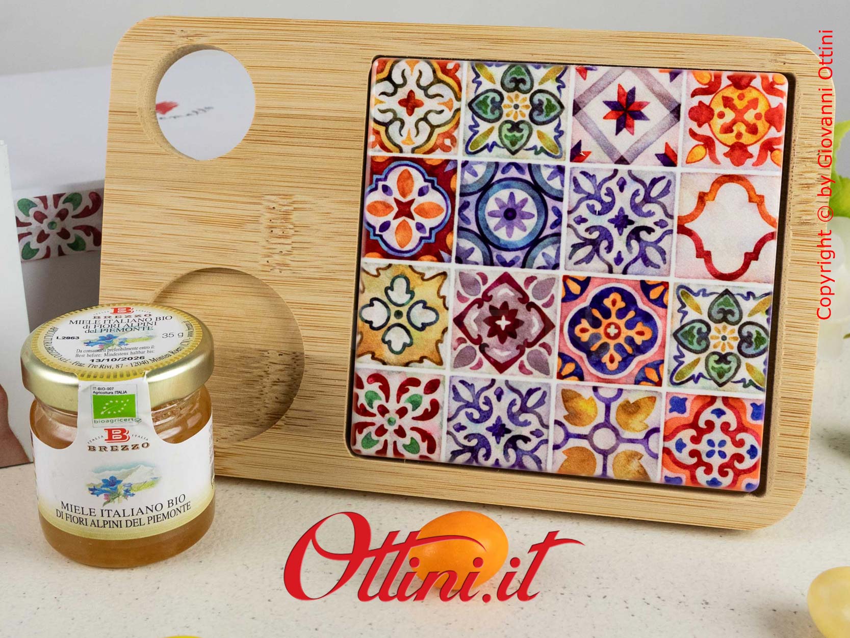 In una tavola con amici e persone care, ritroviamo gioia, calore, amicizia, buon cibo… tutte cose che non sono da “tutti i giorni” e che portiamo nel cuore per sempre. E allora facciamo tutto questo anche a colori con questo Tagliere per formaggi della serie Sicily con miele Bio della Brezzo, fornito assortito in 4 tipologie (ogni tagliere ha un solo barattolo di miele che sarà assortito in uno dei 4 tipi). Realizzato in ceramica smaltata con i colori tipici delle splendide maioliche siciliane, ha un supporto in resistente legno di bambù che, come saprete, ha anche proprietà antibatteriche. I prodotti destinati alla cucina sono in forte crescita, spesso all’apice delle richieste per un “regalo utile”. Le misure sono di 18 cm di lunghezza, 12 di larghezza e di 1,5 di spessore.