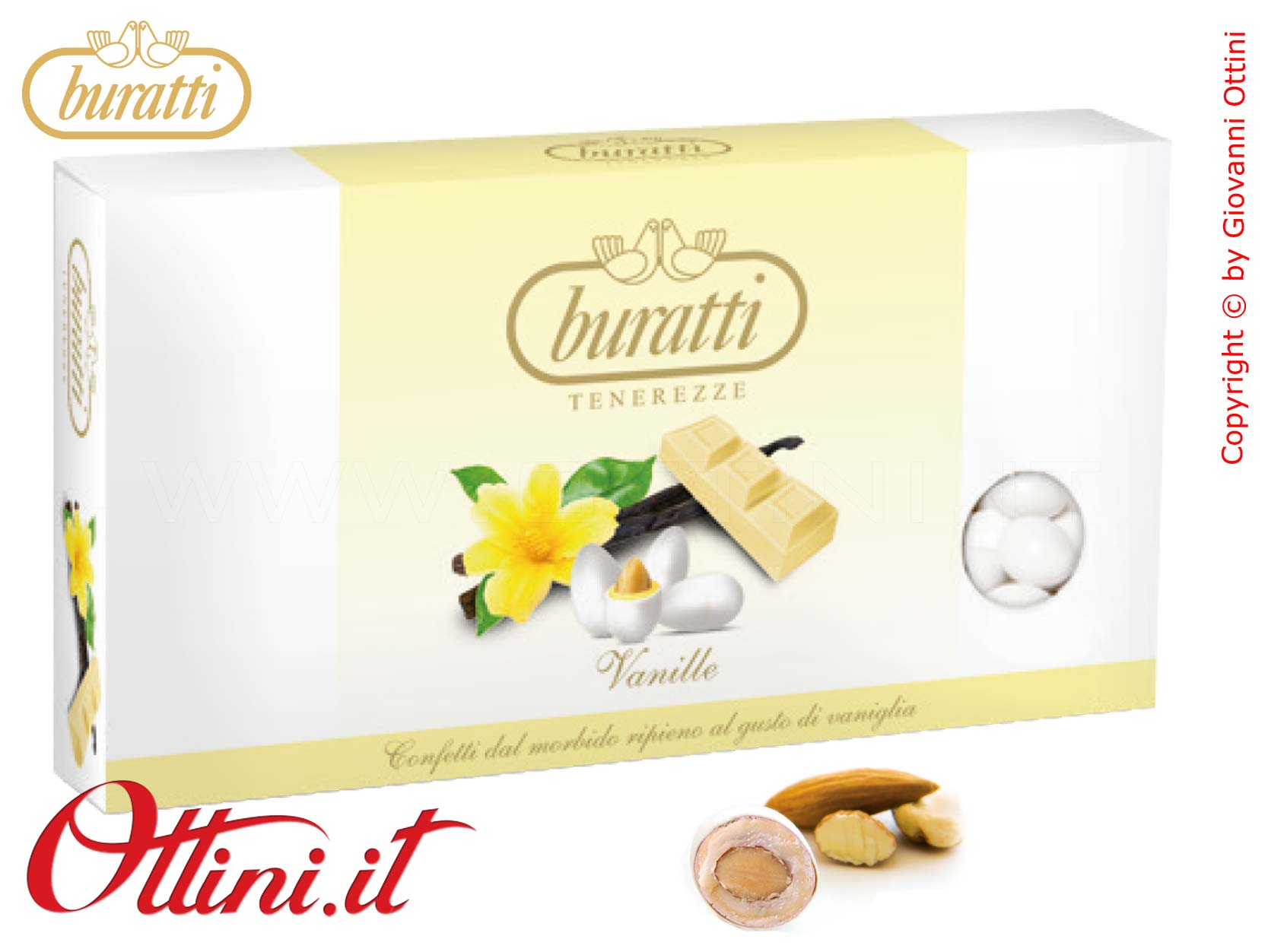 Tenerezze Bianche con cioccolato bianco al latte aromatizzate al gusto di Vaniglia – SENZA GLUTINE. Strepitosi e gustosissimi, sono composti da una morbida mandorla tostata ricoperta da un involucro di cioccolato al latte aromatizzato in un sottile guscio di zucchero. Sono soprattutto morbidi da mordere e masticare, hanno una dimensione “generosa” che appaga ad ogni assaggio.
