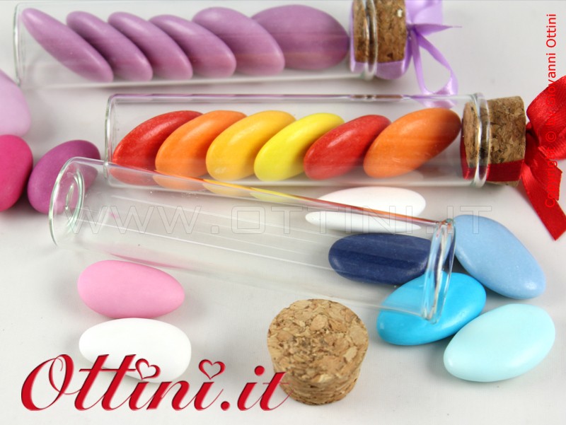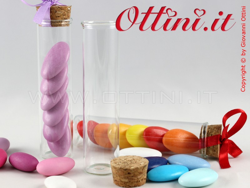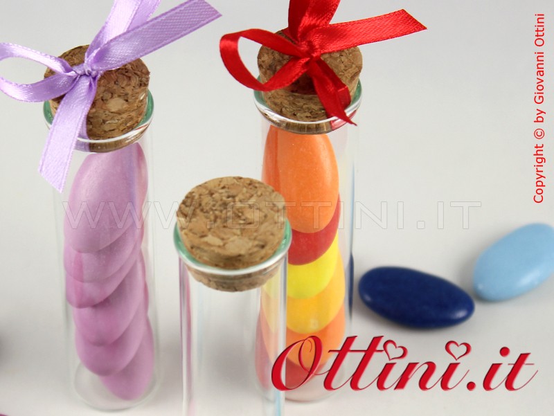 Tubetto in vetro che richiama la linea di una fialetta per alchimisti, ma con un diametro più largo in grado di contenere confetti di qualsiasi tipo. Ogni tubetto è completo del suo tappo in sughero su cui si possono applicare decori di ogni tipo (con la colla a caldo otterrete risultati rapidi che premieranno la vostra creatività).