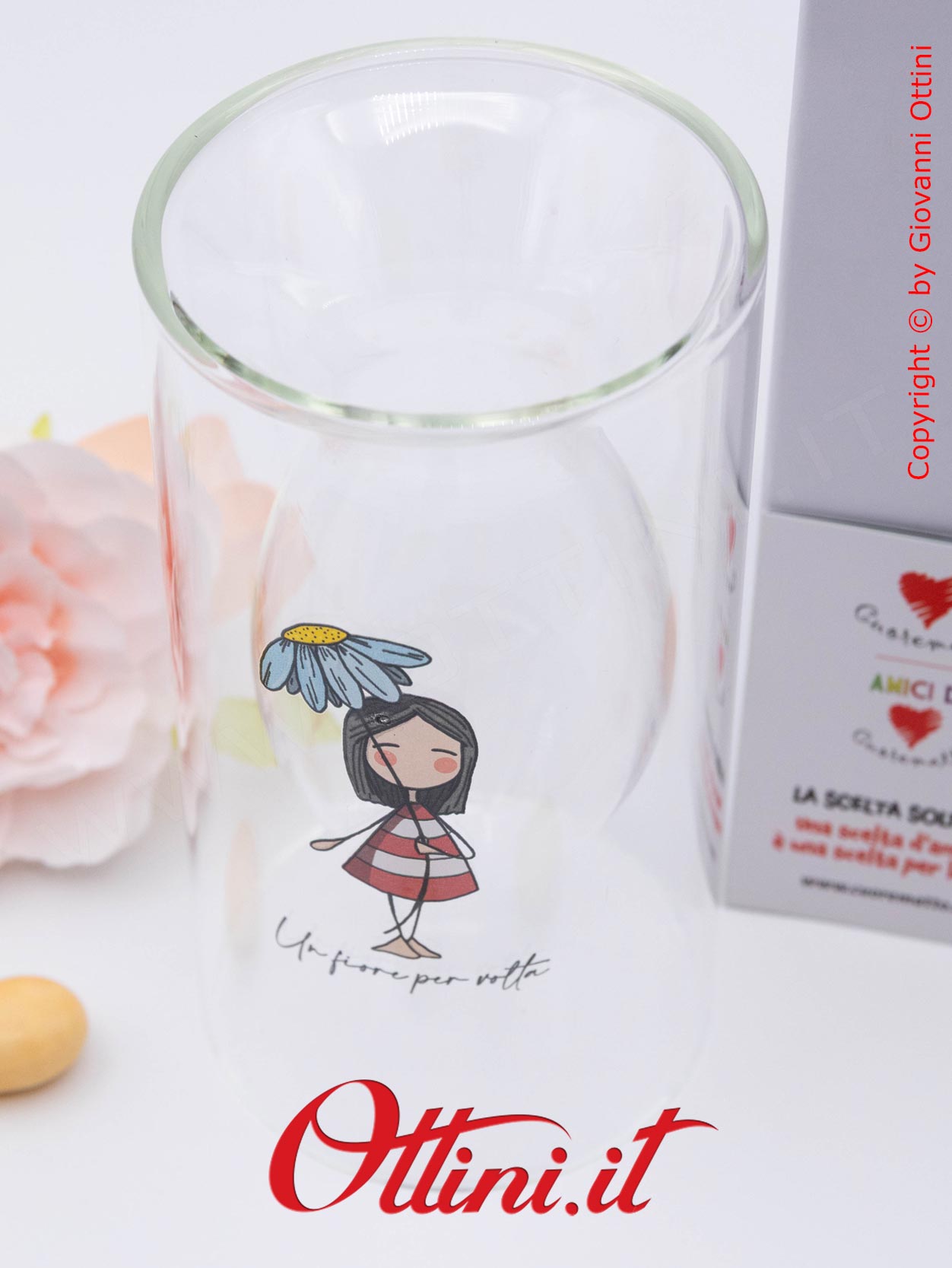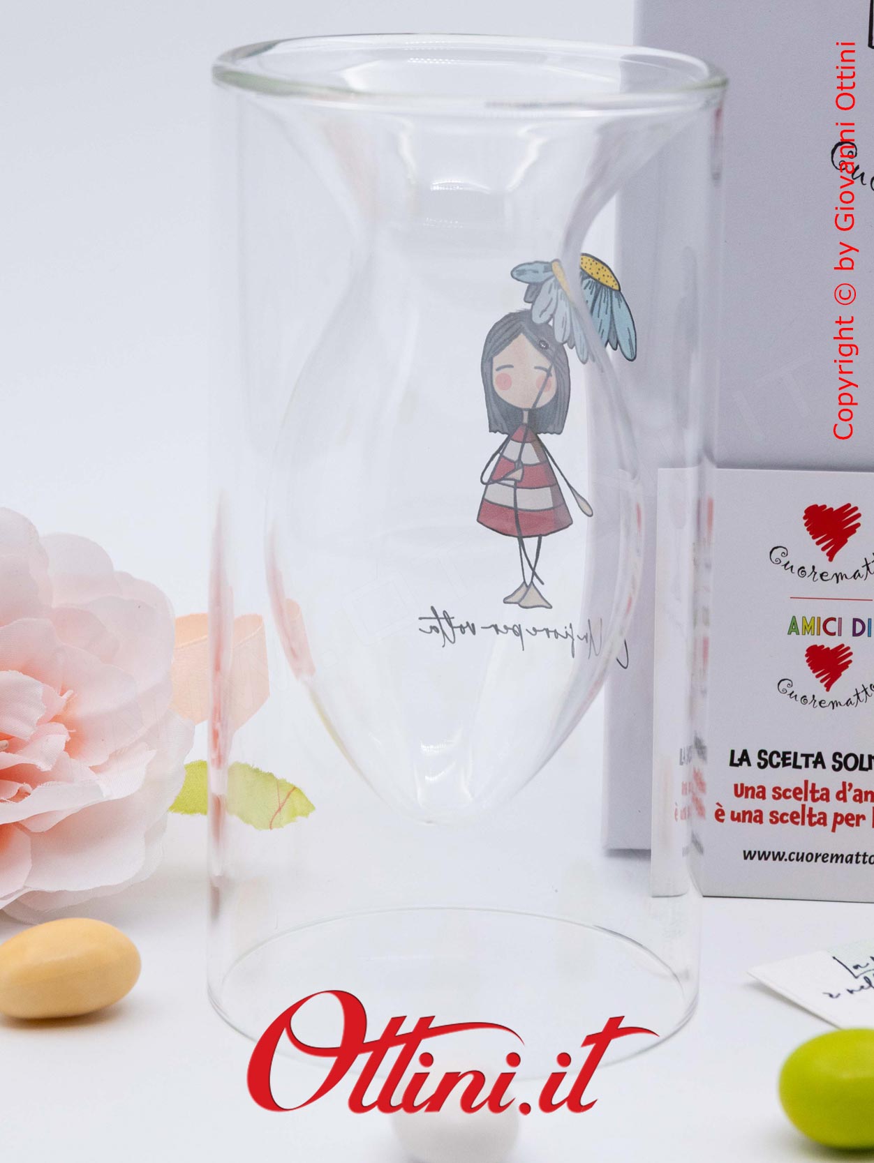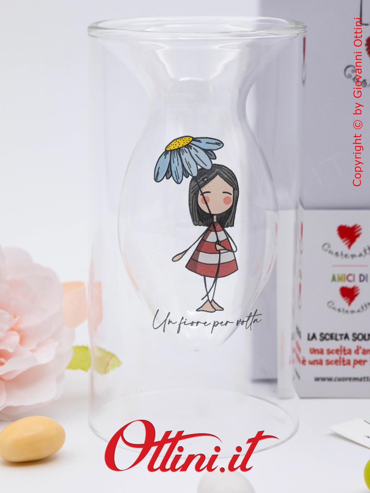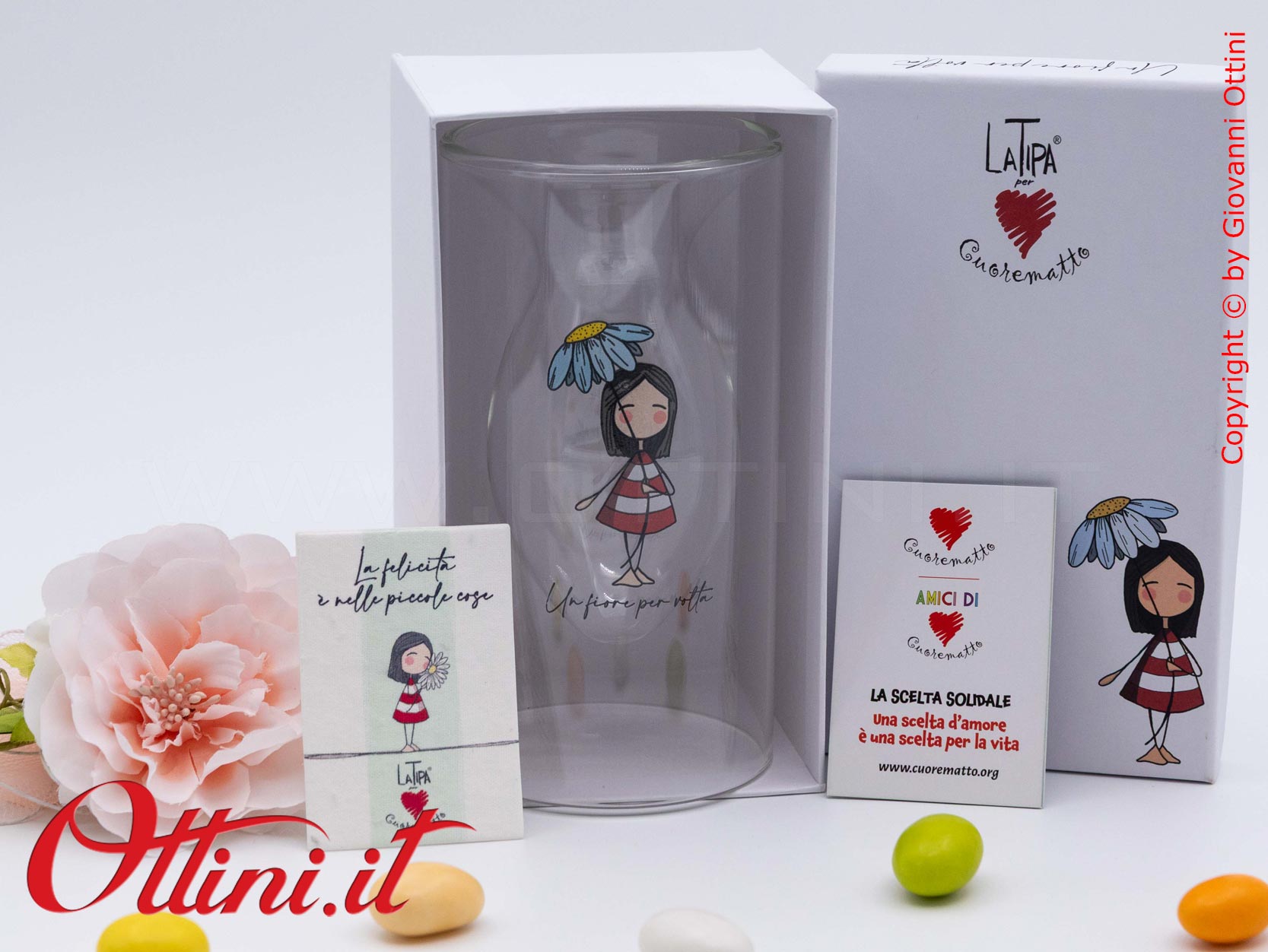 “un fiore per volta…” La Tipa®! Graficamente dedicate ai più giovani, la linea di bomboniere di cui il Vaso Fiori La Tipa fa parte, sono originali, uniche e straordinariamente belle! La Tipa è un personaggio fatto di emozioni, leggera, frivola e irreverente, spesso profonda e saggia, non ha età, ne un tempo e non appartiene ad una razza. Raffigurata spesso con un origami (la barchetta o l’aereo a titolo di esempio), è simbolo della trasformazione che, prima o poi, coinvolge tutti. Realizzato in vetro borosilicato, questo vasetto potrà accogliere dei fiorellini per rallegrare la casa. Cuorematto e La Tipa® insieme per un progetto solidale diventato realtà.