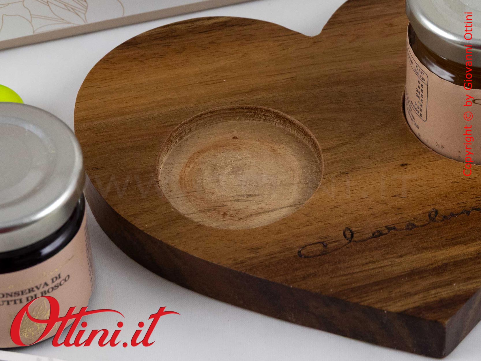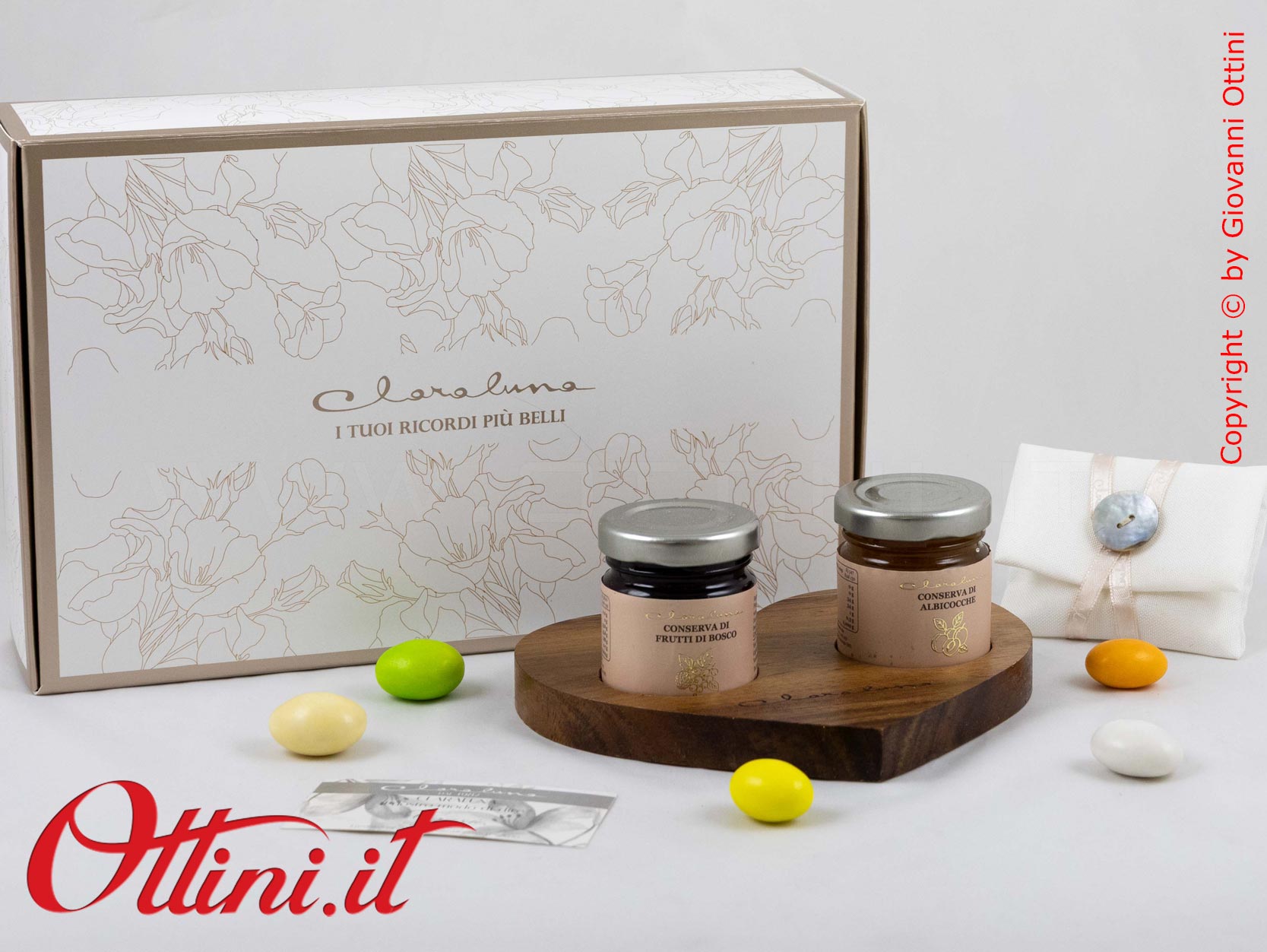 Le bomboniere Gastronomiche sono una valida alternativa per coloro che cercano un regalo che coinvolga l’esperienza gustativa: Claraluna propone alcuni prodotti diversificati tra marmellate e creme, con corredi accessori da riutilizzare. In questa proposta abbiamo una vassoio in legno massello di acacia completo di marmellate ai Frutti di bosco e di albicocca, entrambi da 40gr.