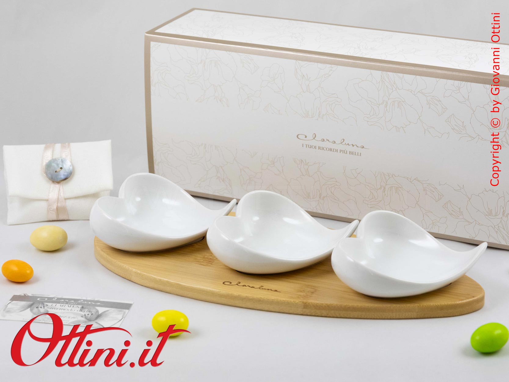 Con un ordinativo minimo di 50 pz del Vassoio Bamboo con tre ciotole cuore (o di bomboniere miste Claraluna abbinate alla promozione), potrete accedere alla campagna promozionale che vi permette di avere le PARTECIPAZIONI di Claraluna IN OMAGGIO, comprensive di servizio stampa!!! Potrete scegliere tra ben 6 modelli bellissimi! Per le condizioni e le modalità FATE CLICK QUI.