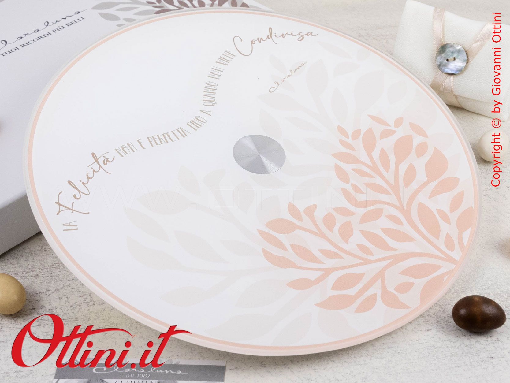 Se cercate un prodotto originale per dare un tocco di classe alla vostra tavola avete trovato il prodotto giusto: Il Vassoio Girevole con decoro a forma di cuore rosa. Gli amanti delle cose utili e funzionali, anche eleganti, soprattutto se destinate alla convivialità degli ospiti, sono in continua crescita e cercano soluzioni adatte alle proprie esigenze. Claraluna ha puntato molto su questa linea di articoli, cercando soluzioni “nuove” nel contesto della regalistica di eventi, che sia un matrimonio o un anniversario, e le ha personalizzate con frasi e aneddoti di carattere emozionale. “La Felicità non è perfetta fino a quando non viene condivisa” è il messaggio stampato sotto al vetro di appoggio. Realizzato in vetro, facile da pulire, ha un diametro di cm. 25 e uno spessore totale di cm. 2.
