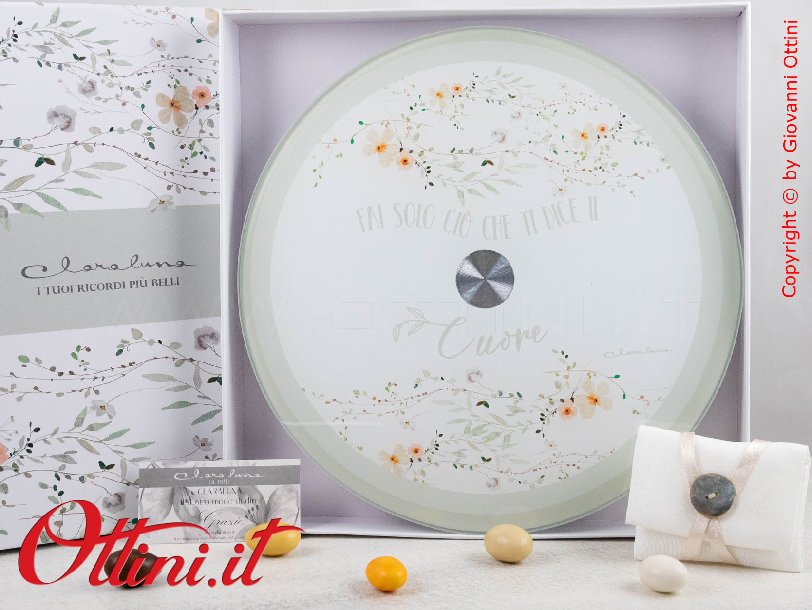 Con un ordinativo minimo di 50 pz del Vassoio Girevole con Decoro Floreale Verde (o di bomboniere miste Claraluna abbinate alla promozione), potrete accedere alla campagna promozionale che vi permette di avere le PARTECIPAZIONI di Claraluna IN OMAGGIO, comprensive di servizio stampa!!! Potrete scegliere tra ben 6 modelli bellissimi! Per le condizioni e le modalità FATE CLICK QUI.