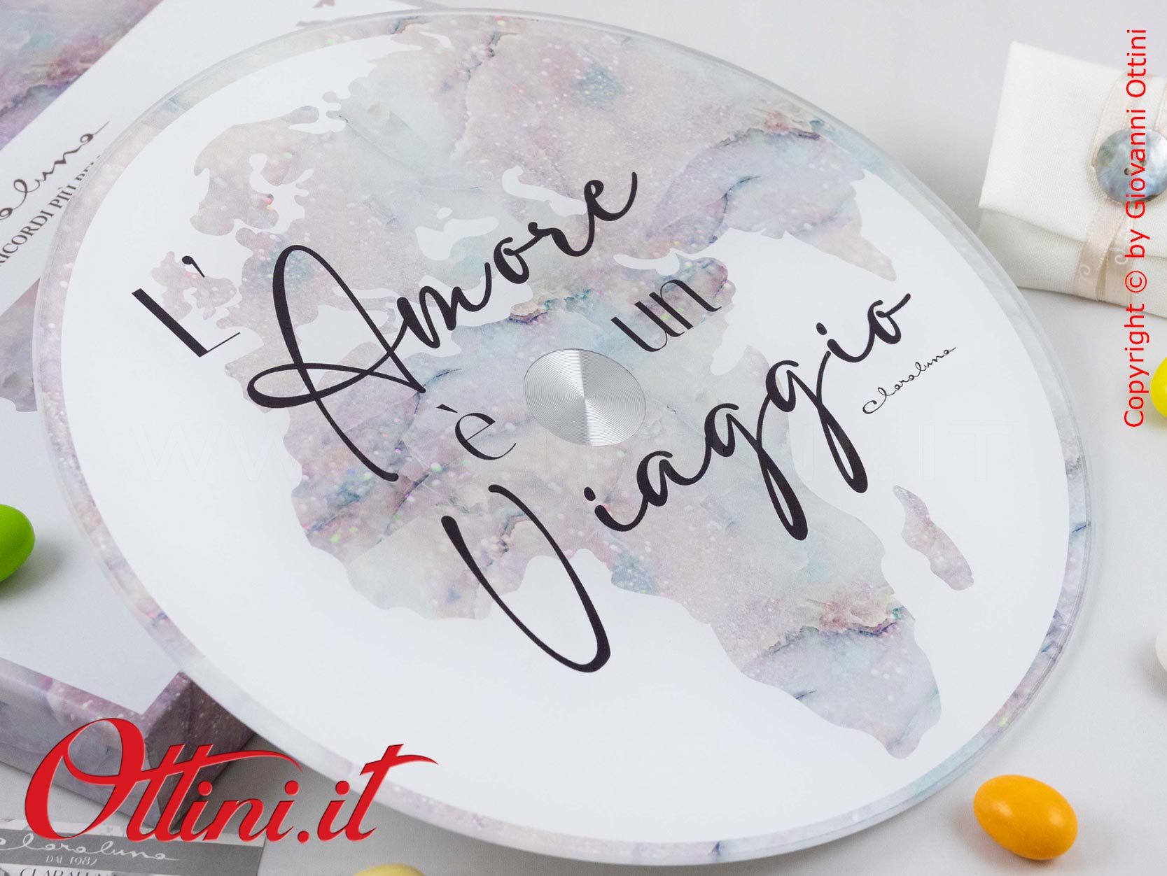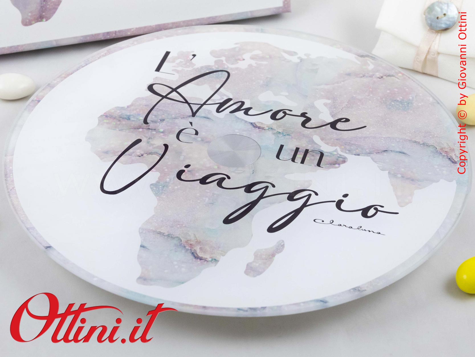 Se cercate un prodotto originale per dare un tocco di classe alla vostra tavola avete trovato il prodotto giusto: Il Vassoio Girevole con decoro topografico del mondo per valorizzare la presentazione dei cibi nelle nostre tavole. Gli amanti delle cose utili e funzionali, anche eleganti, soprattutto se destinate alla convivialità degli ospiti, sono in continua crescita e cercano soluzioni adatte alle proprie esigenze. Claraluna ha puntato molto su questa linea di articoli, cercando soluzioni “nuove” nel contesto della regalistica di eventi, che sia un matrimonio o un anniversario, e le ha personalizzate con frasi o parole di carattere emozionale. “L’Amore è un viaggio” è la frase emozionale con cui hanno personalizzato questo prodotto. Realizzato in vetro, facile da pulire, ha un diametro di cm. 25 e uno spessore totale di cm. 2.